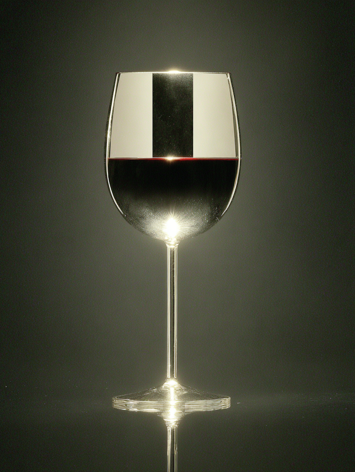 A wine glass with red wine refracts a black and white striped background, creating a striking optical effect with light and distortion.