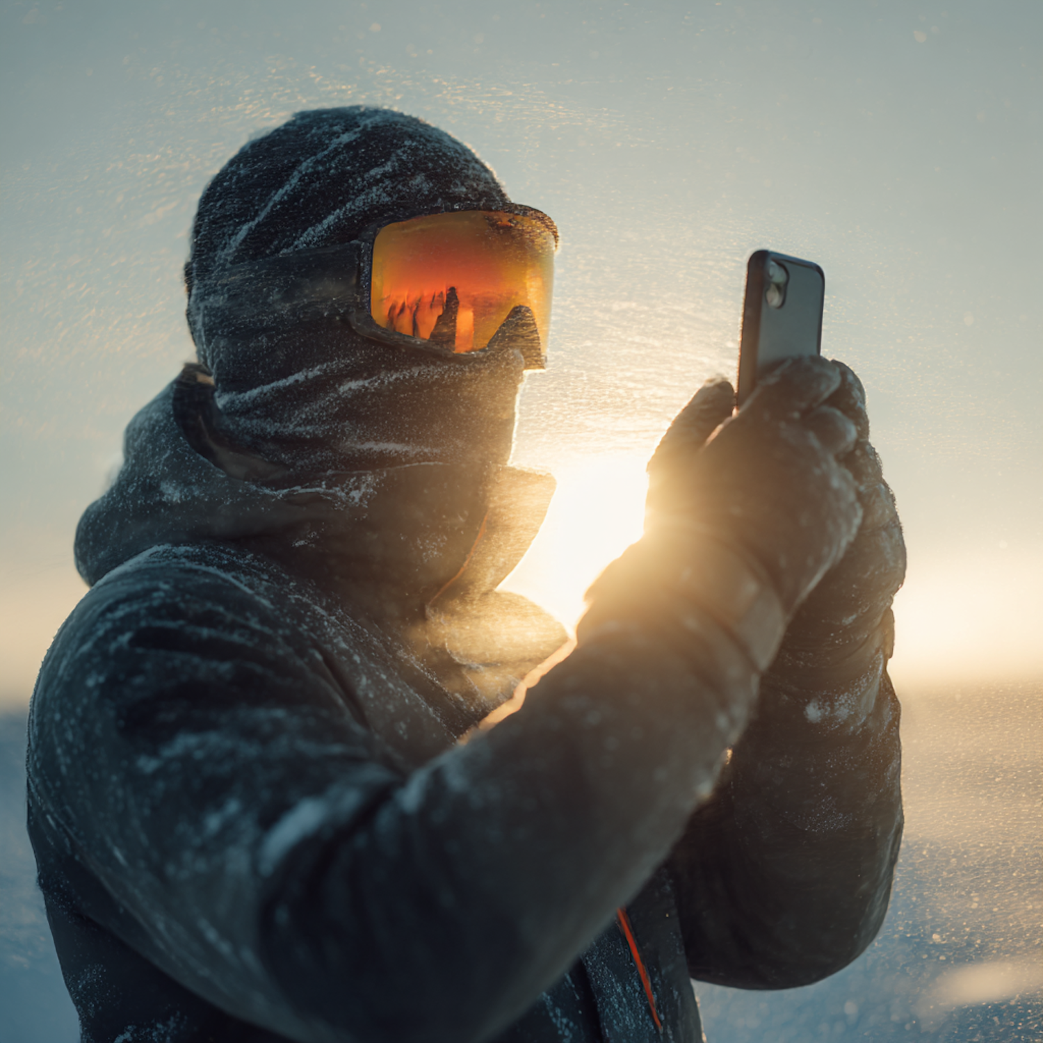 A person in winter gear uses a smartphone in a snowy setting, with sunlight reflecting off their goggles and snow particles in the air.