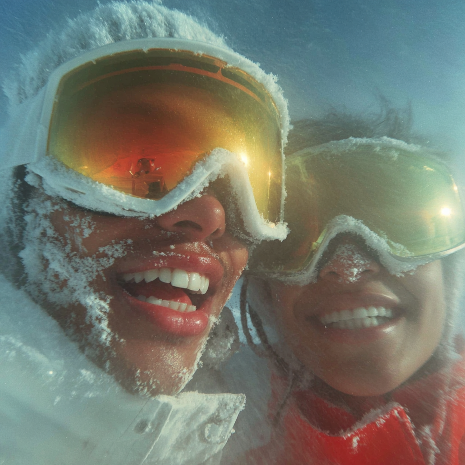 Two friends smiling in a frosty, snowy setting, wearing ski goggles and winter gear, enjoying a cold outdoor adventure.