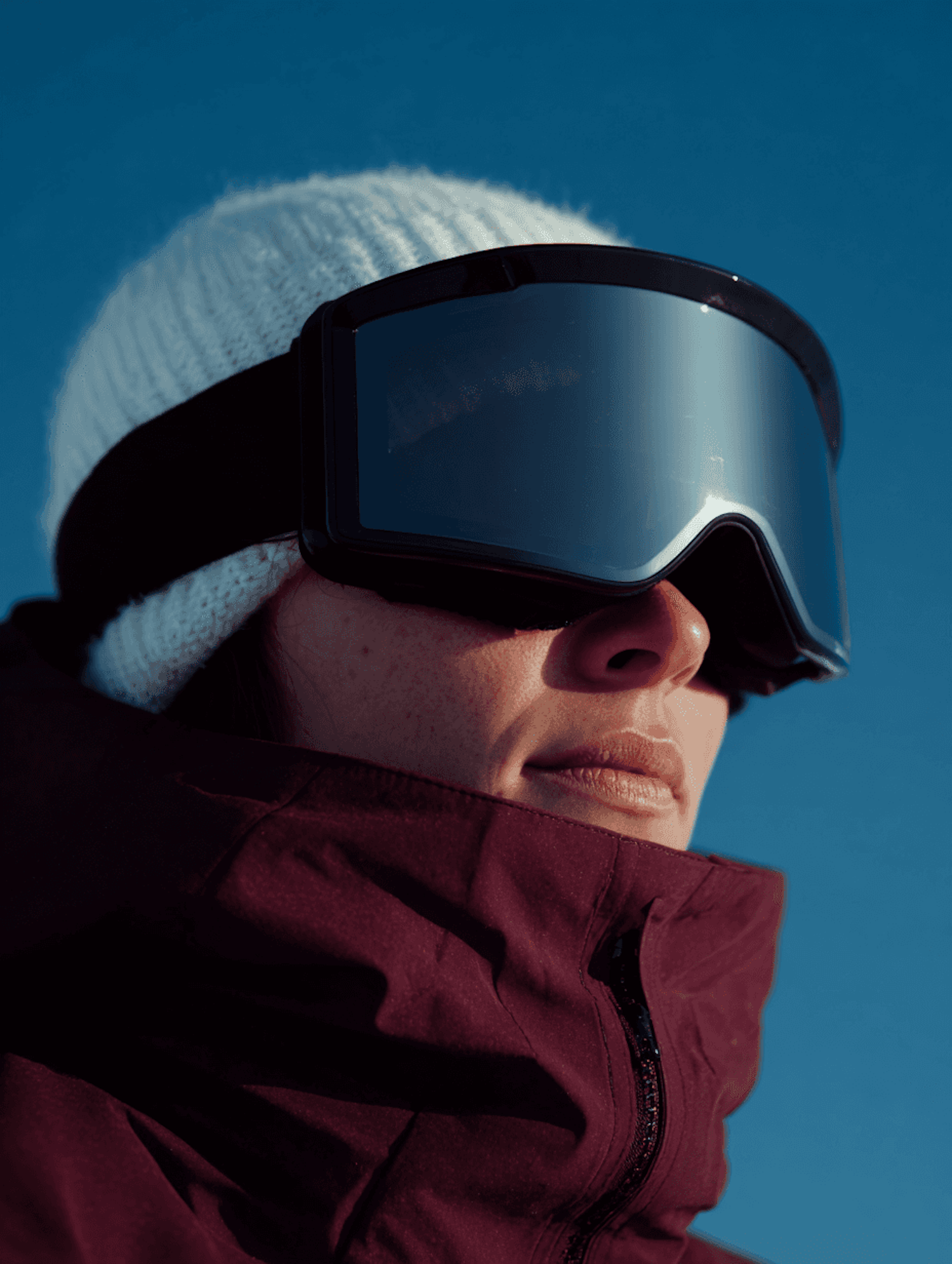 Close-up of a person in ski goggles and a winter jacket against a clear blue sky, showcasing winter sports gear.