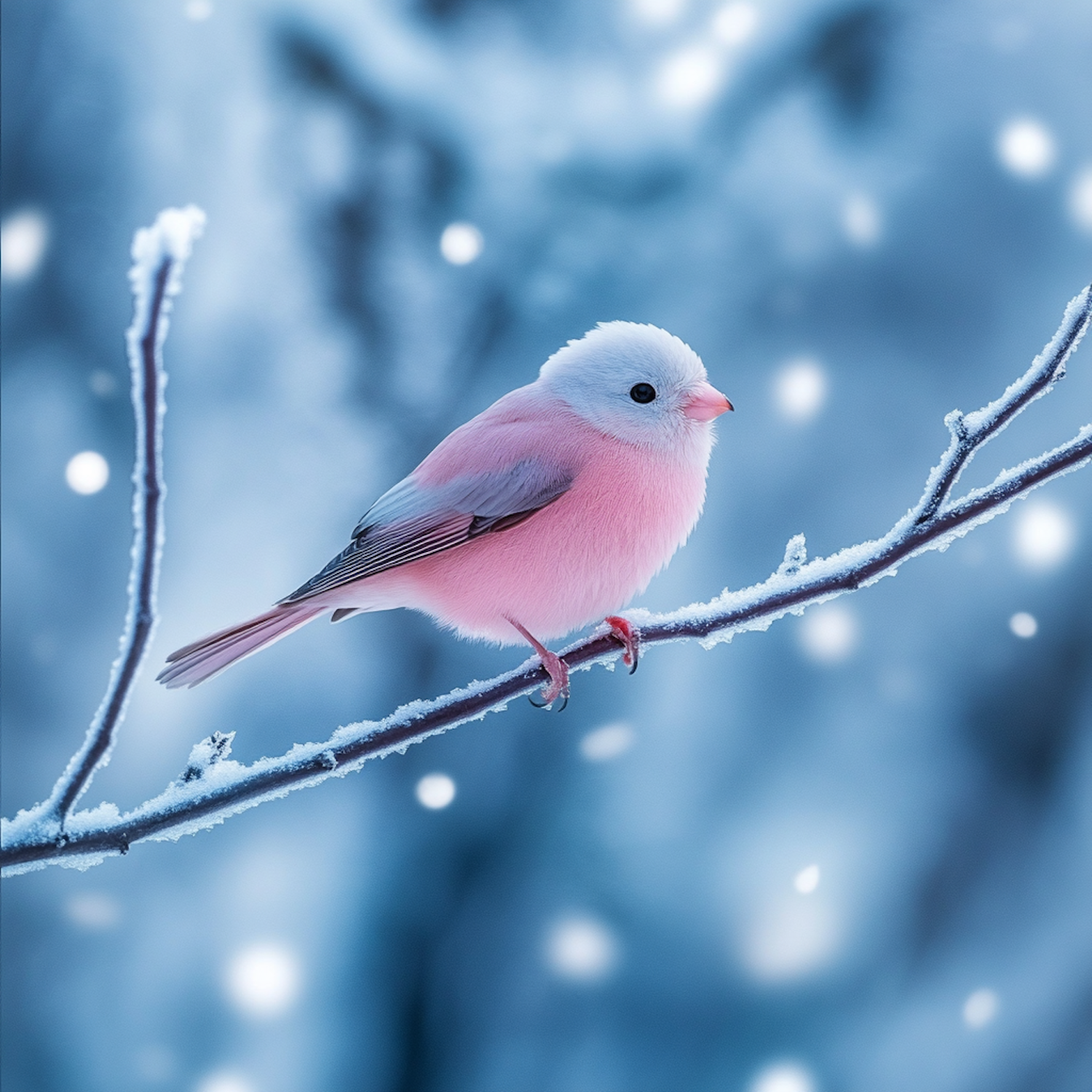A pink bird perched on a snowy branch with falling snowflakes, set against a serene blue winter background.