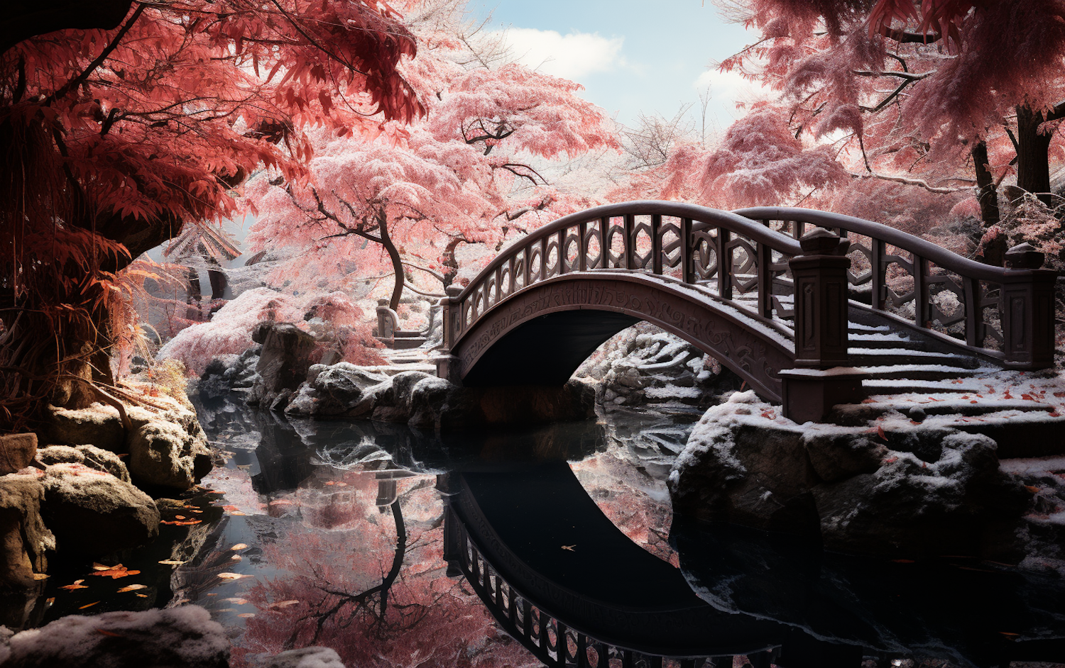 Enchanting wooden bridge over a reflective stream, surrounded by pink foliage and snow-dusted trees in a serene winter landscape.