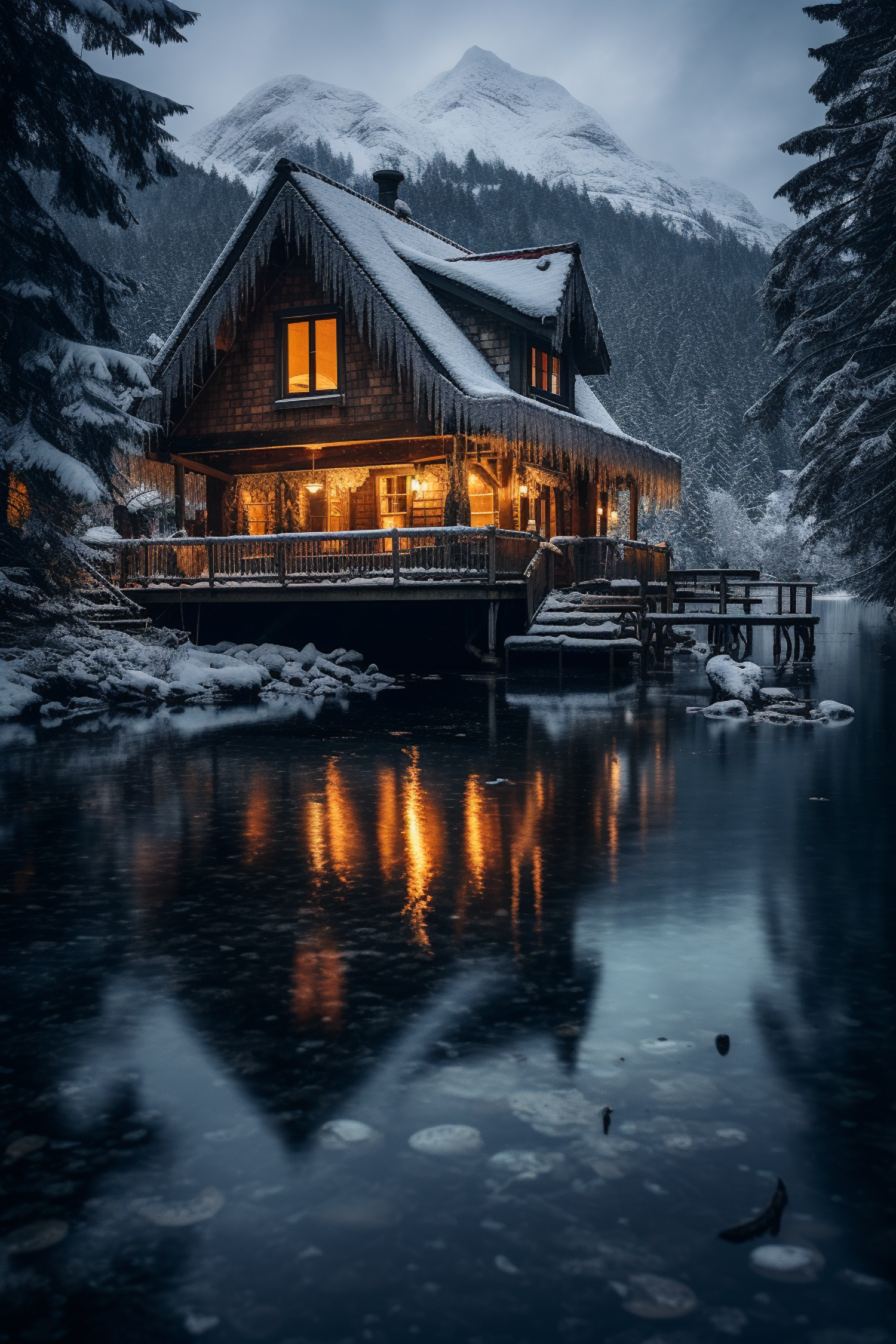 Cozy cabin in snowy forest with warm lights reflecting on icy lake, surrounded by pine trees and mountains.