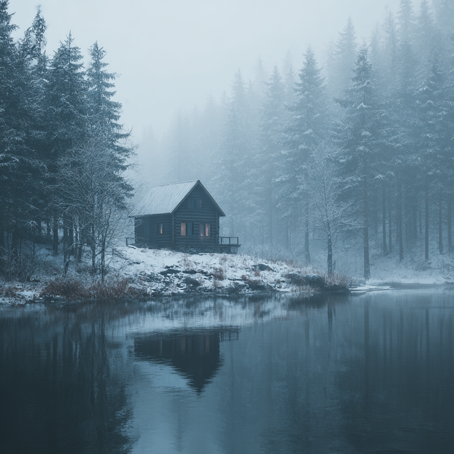 A cozy cabin by a snowy lake surrounded by misty evergreen trees, reflecting tranquility and winter serenity.