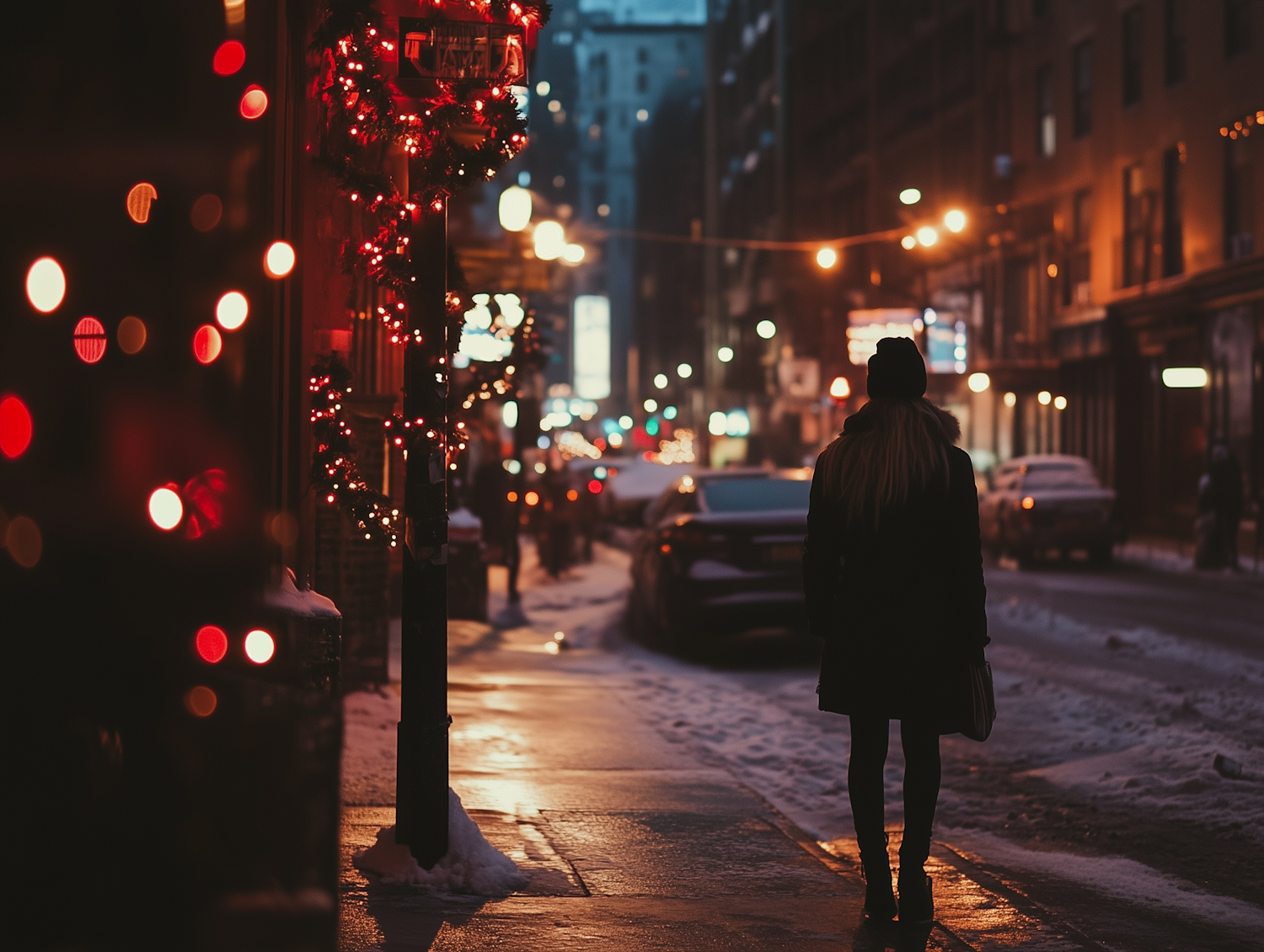 Festive city street at night with holiday lights, snow, and a silhouetted figure walking. Warm, inviting winter scene.