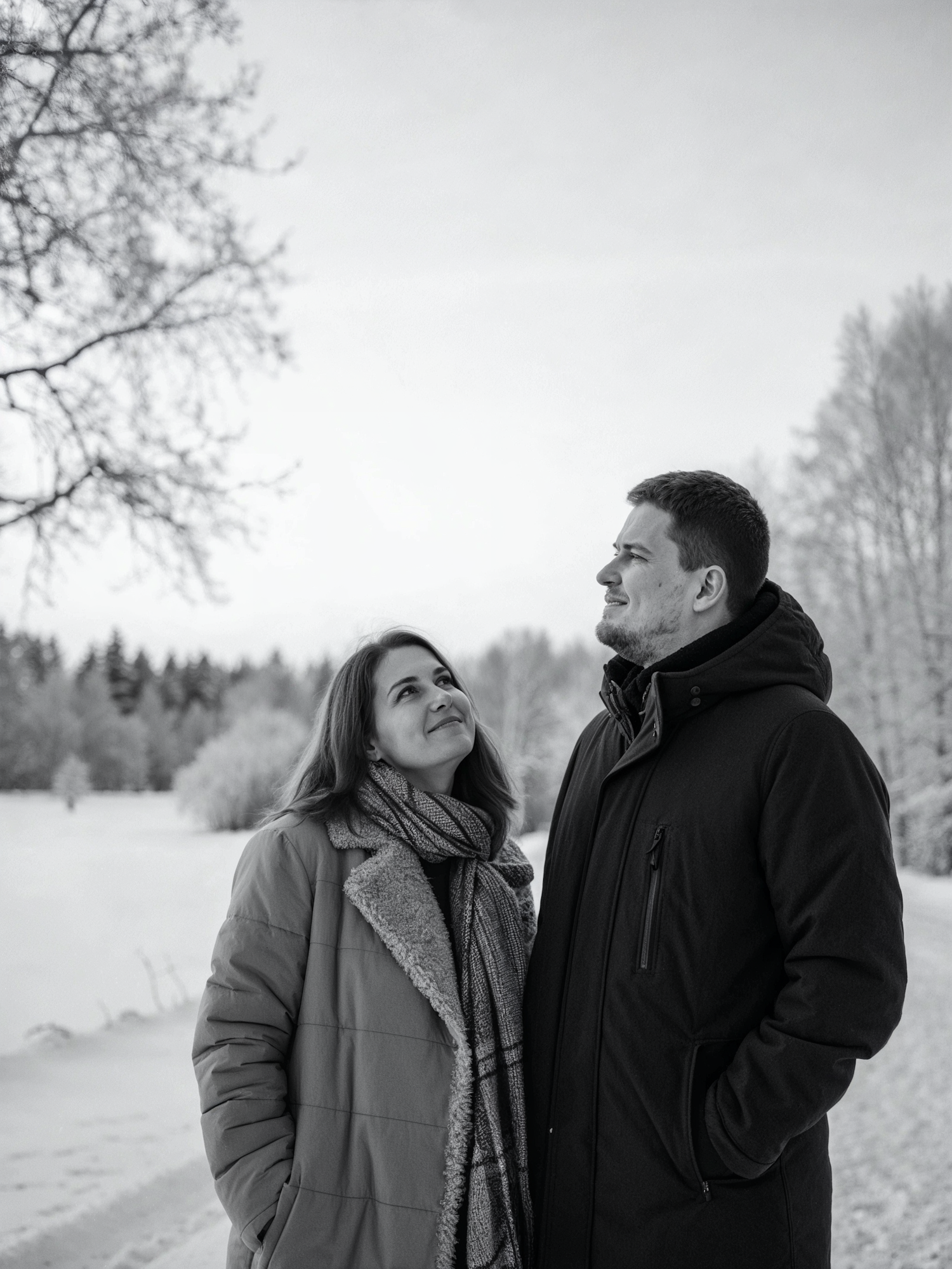 A couple in winter coats enjoys a snowy landscape, sharing a serene moment. Black and white photo with a peaceful, wintry backdrop.