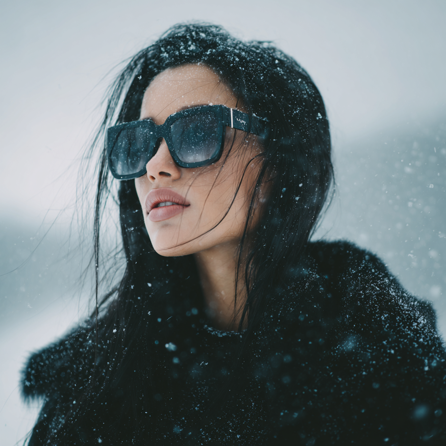 A woman in sunglasses and a black coat stands in falling snow, her hair tousled and expression calm, creating a serene winter scene.