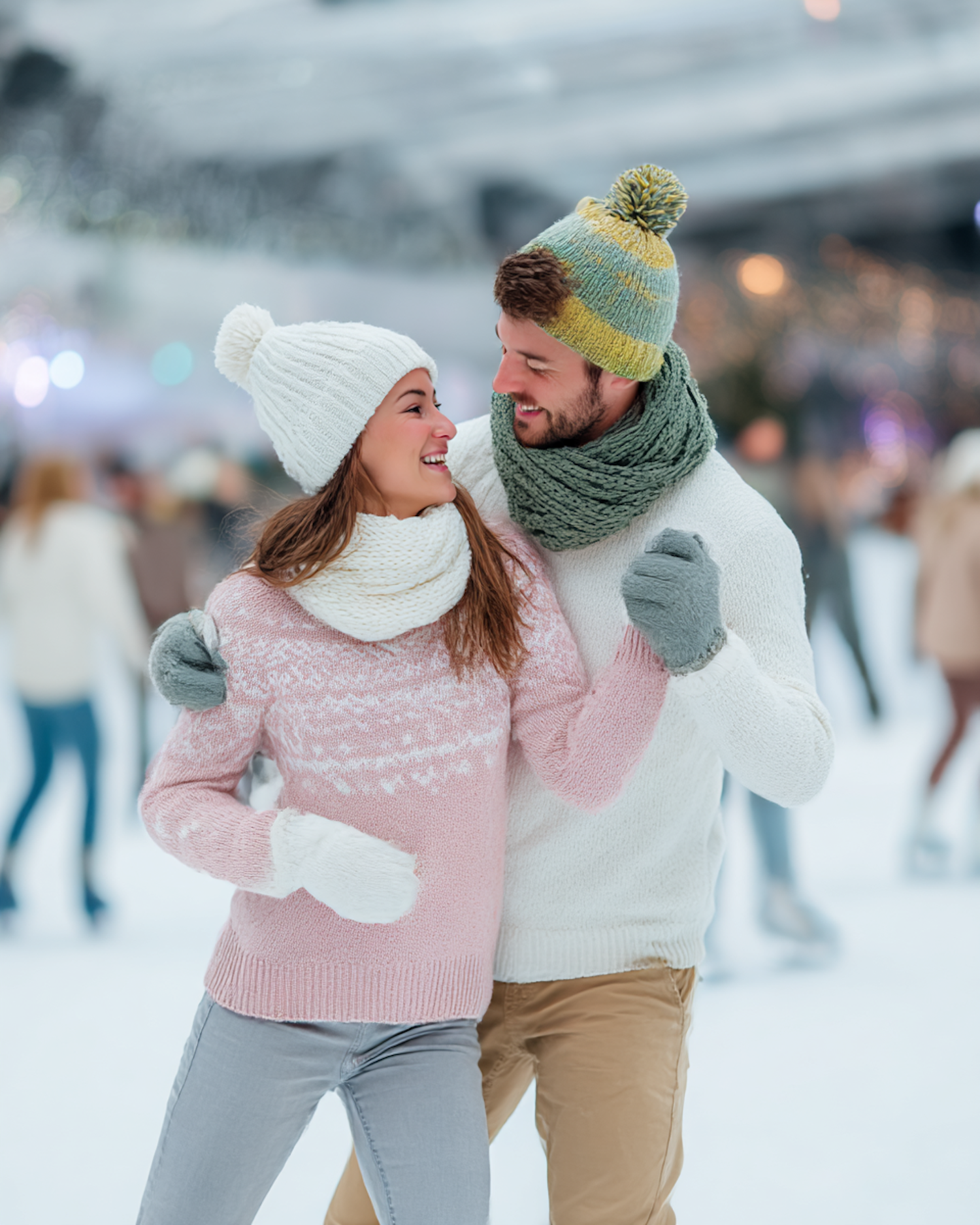 A happy couple in cozy winter attire enjoying a snowy day together, surrounded by a festive and lively outdoor setting.