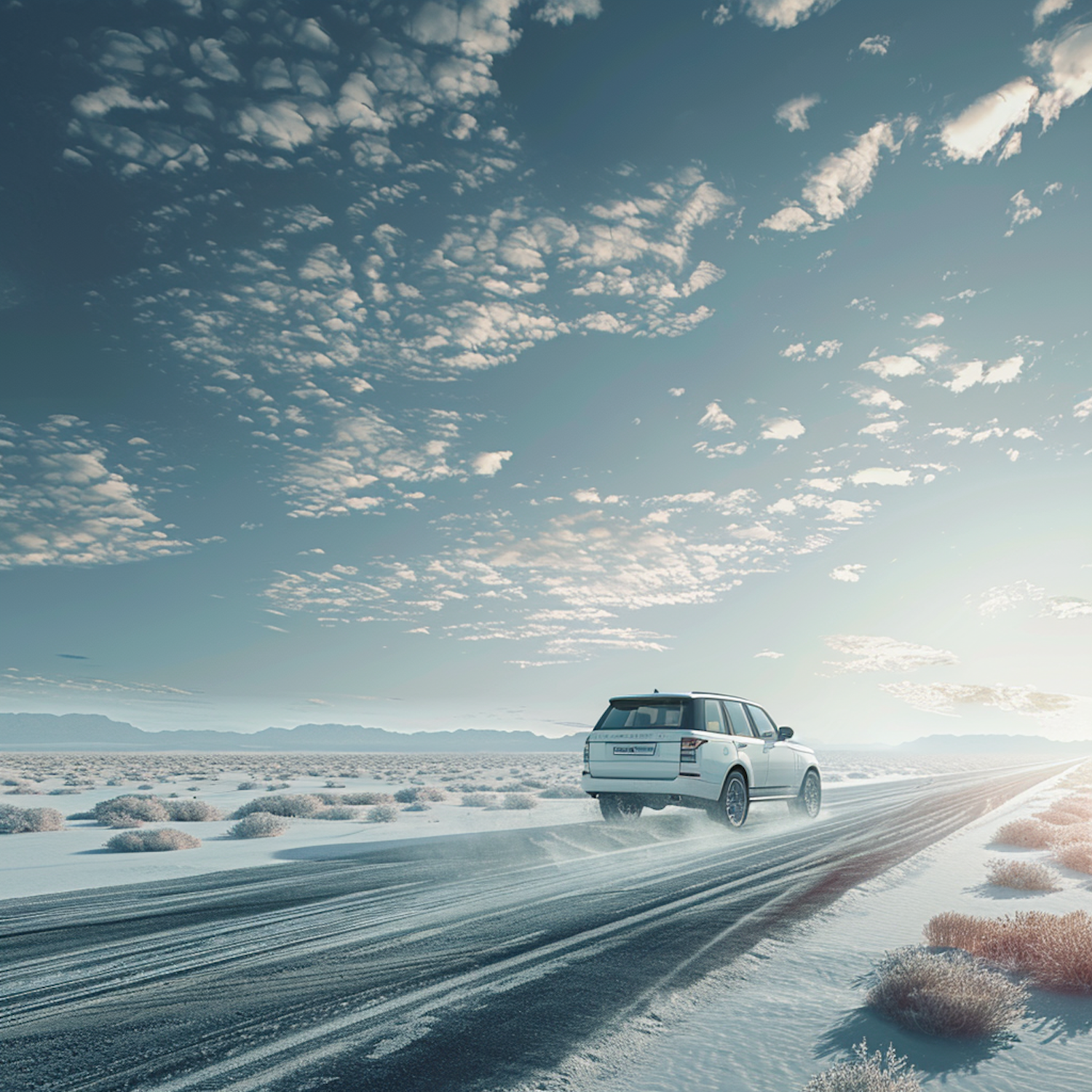 White SUV driving on a snowy road under a vast, cloud-filled sky, with distant mountains on the horizon.