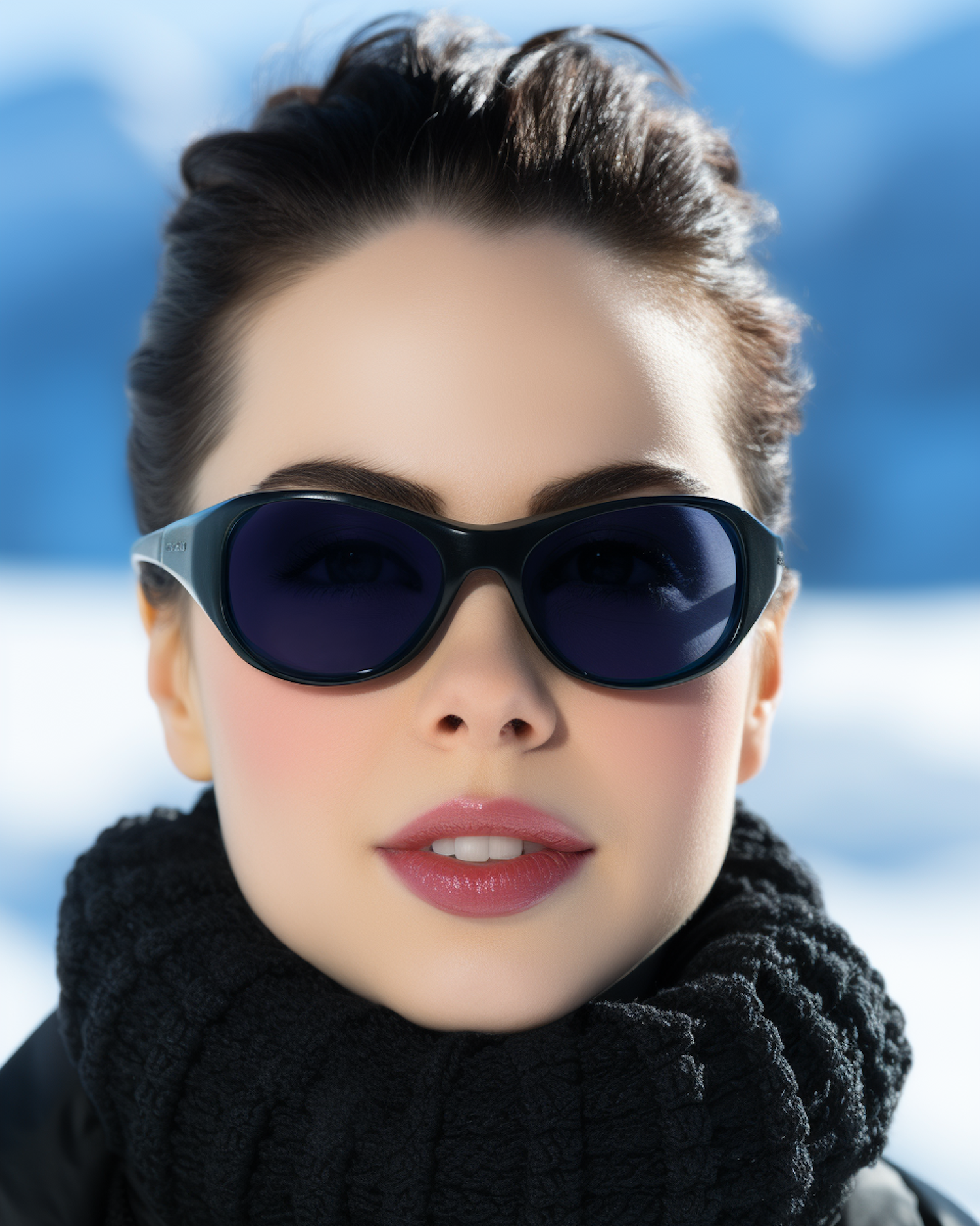 Stylish woman in black sunglasses and scarf against a snowy backdrop, exuding elegance and winter fashion vibes.