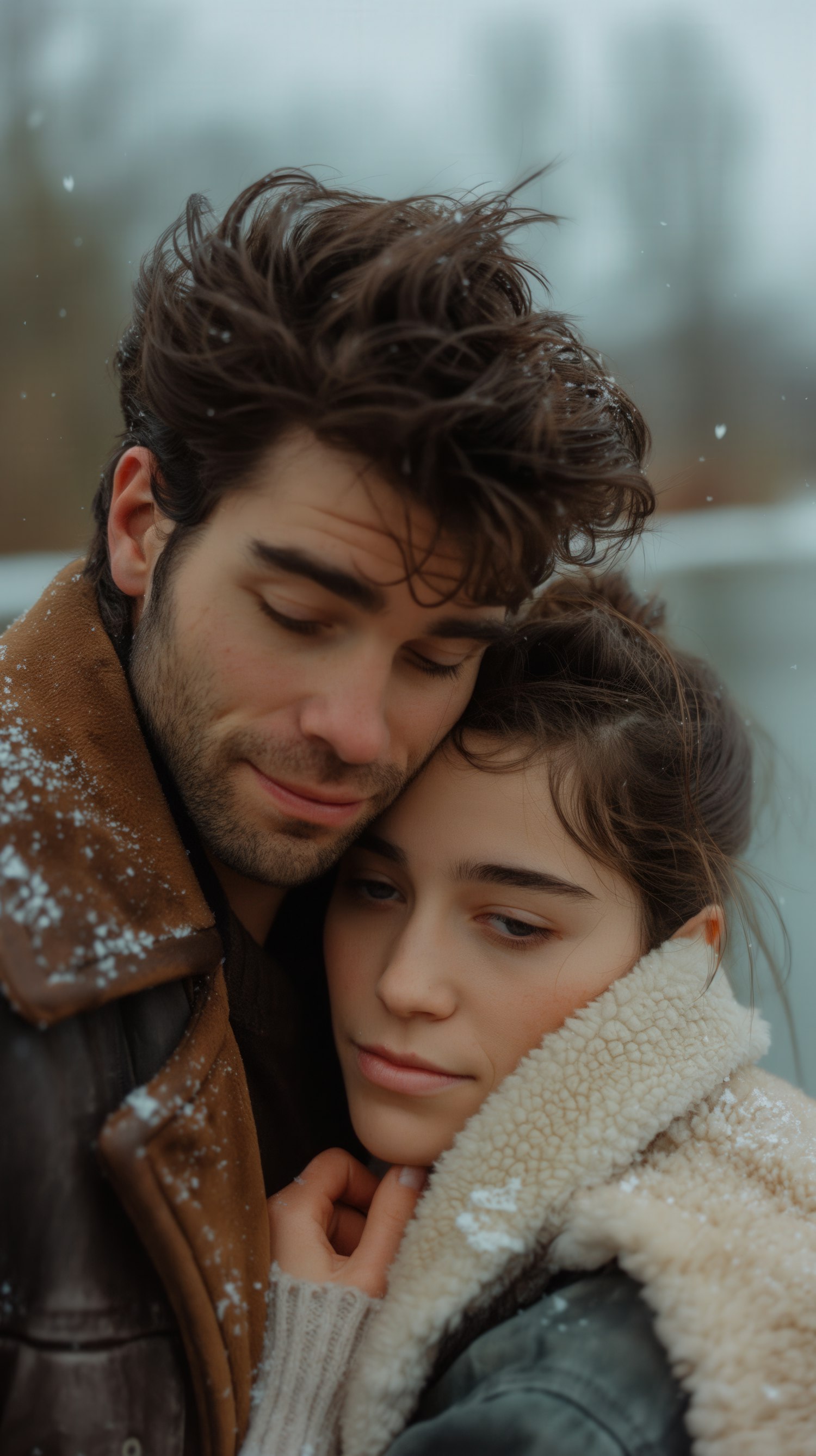 A couple embraces warmly in a snowy setting, wearing cozy jackets. Snowflakes add a romantic touch to their serene expressions.
