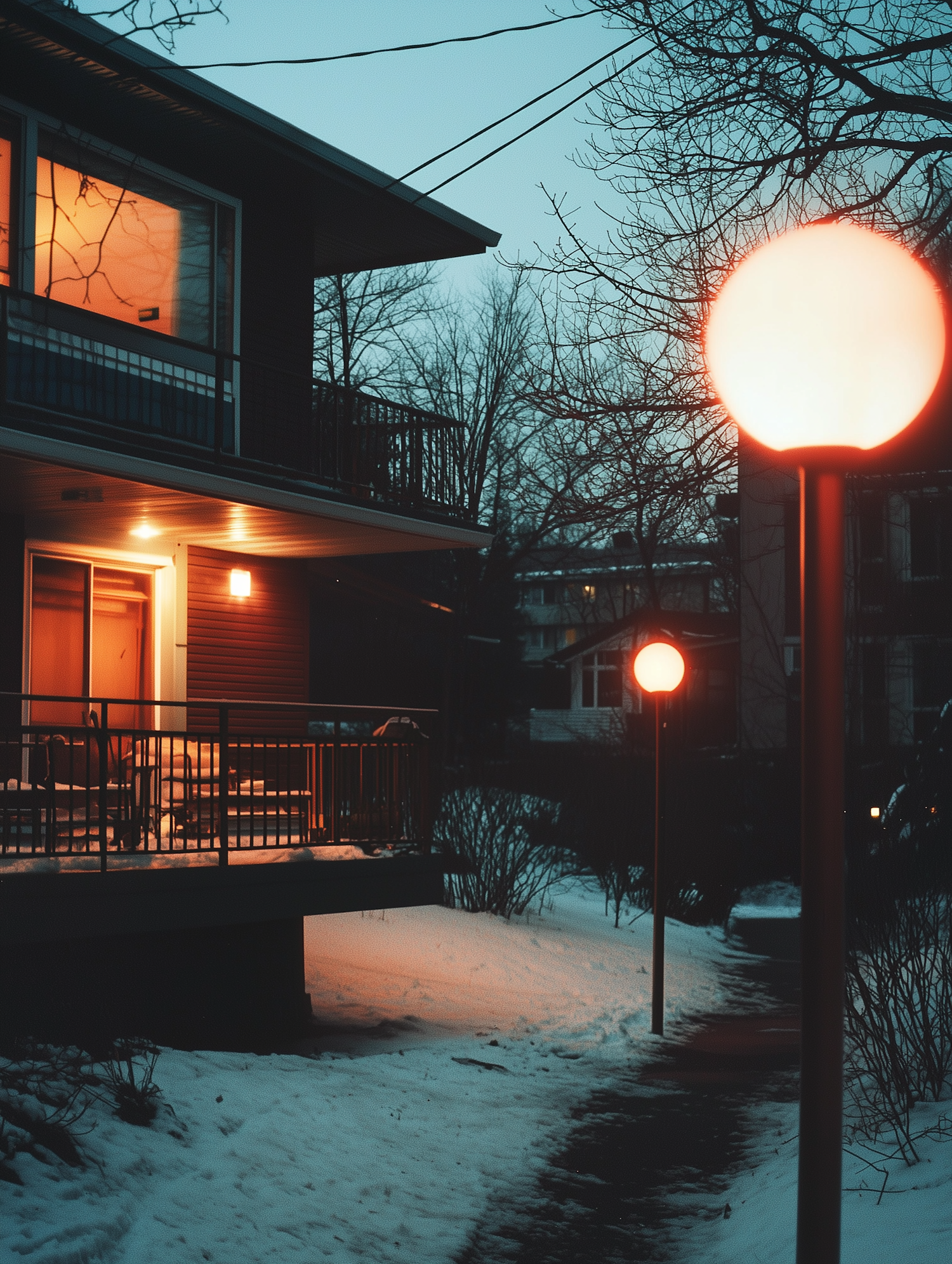 A cozy house glows warmly on a snowy evening, with streetlights illuminating a quiet pathway under a twilight sky.