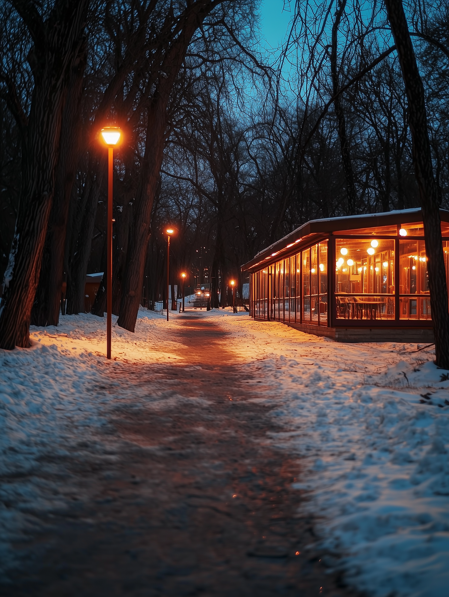 Snowy path lit by warm streetlights and a glowing café under a twilight sky, creating a cozy winter evening ambiance.