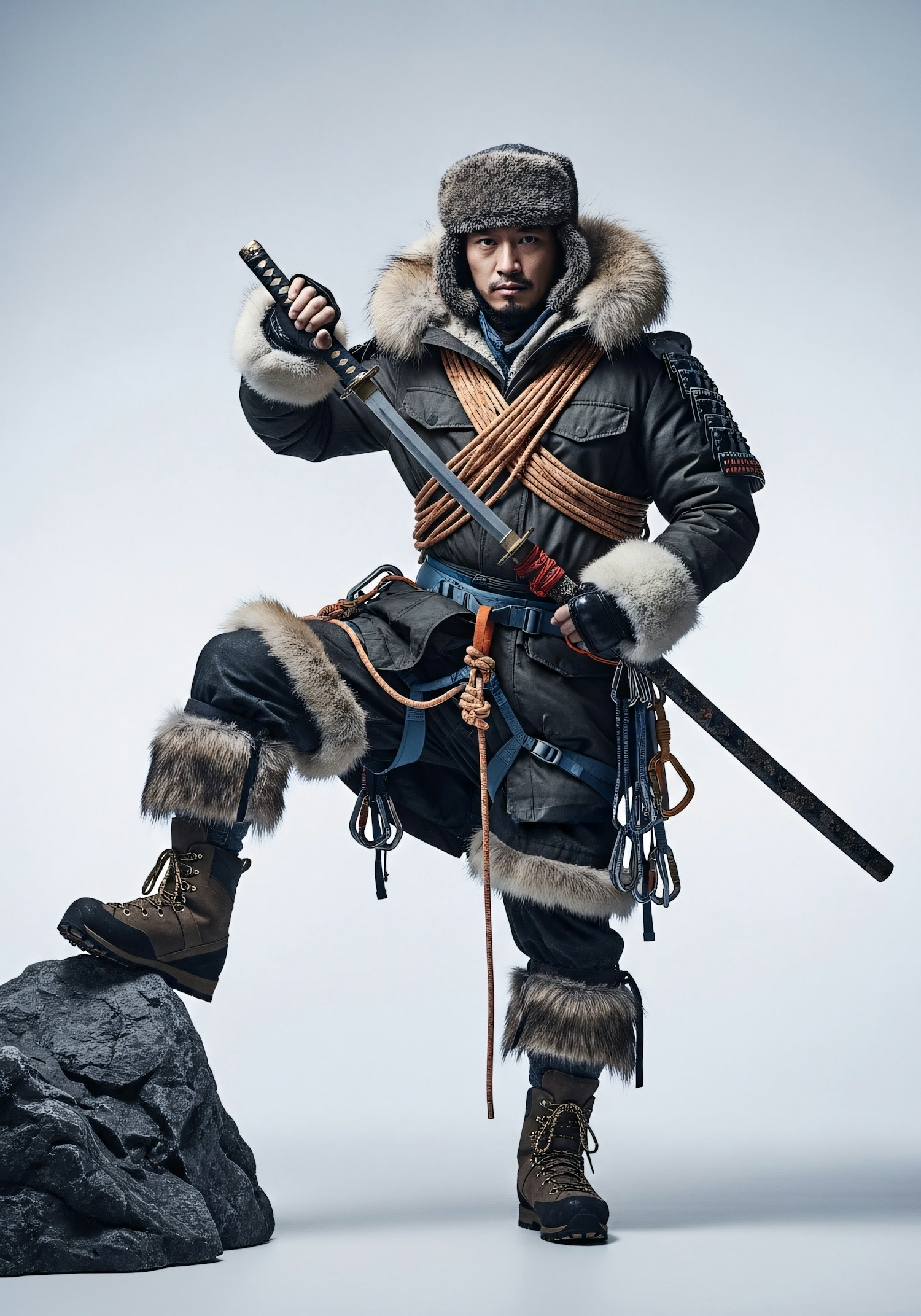 A person in fur-lined winter gear with a katana and climbing equipment, ready for an expedition in a neutral setting.