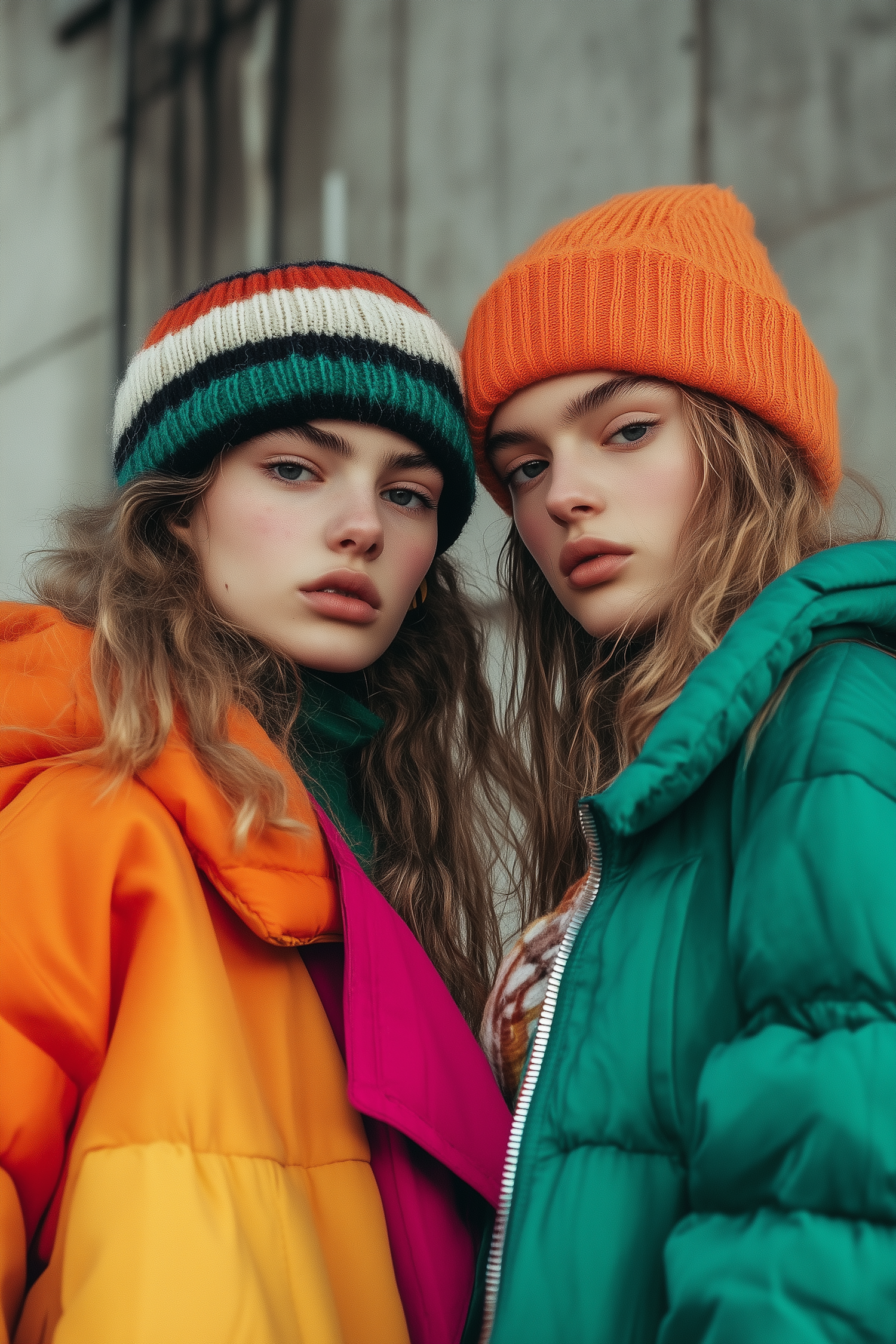 Two women in colorful winter jackets and beanies pose in an urban setting, showcasing vibrant fashion and style.