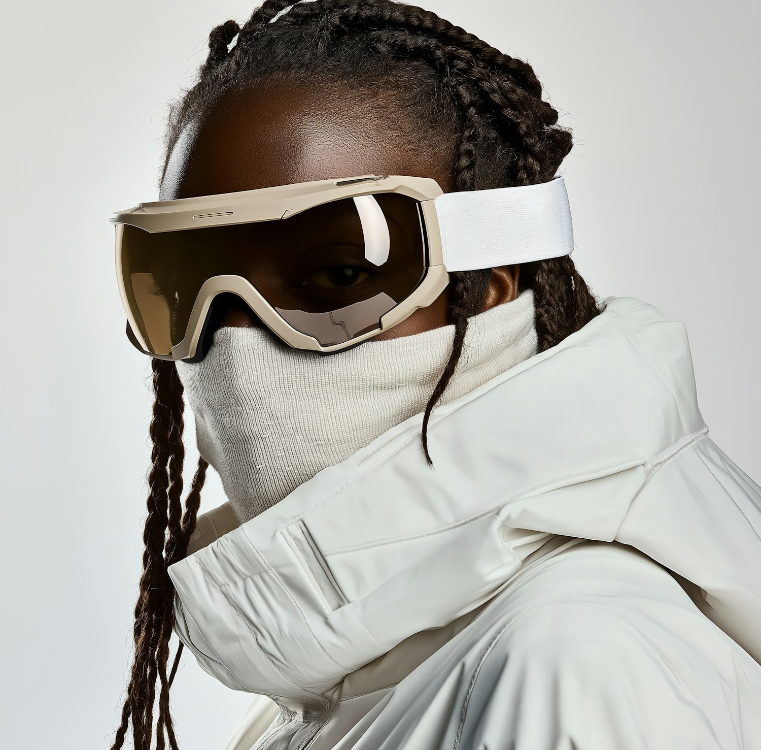 Stylish winter portrait featuring a person in a white jacket, ski goggles, and a face covering, showcasing modern winter fashion.