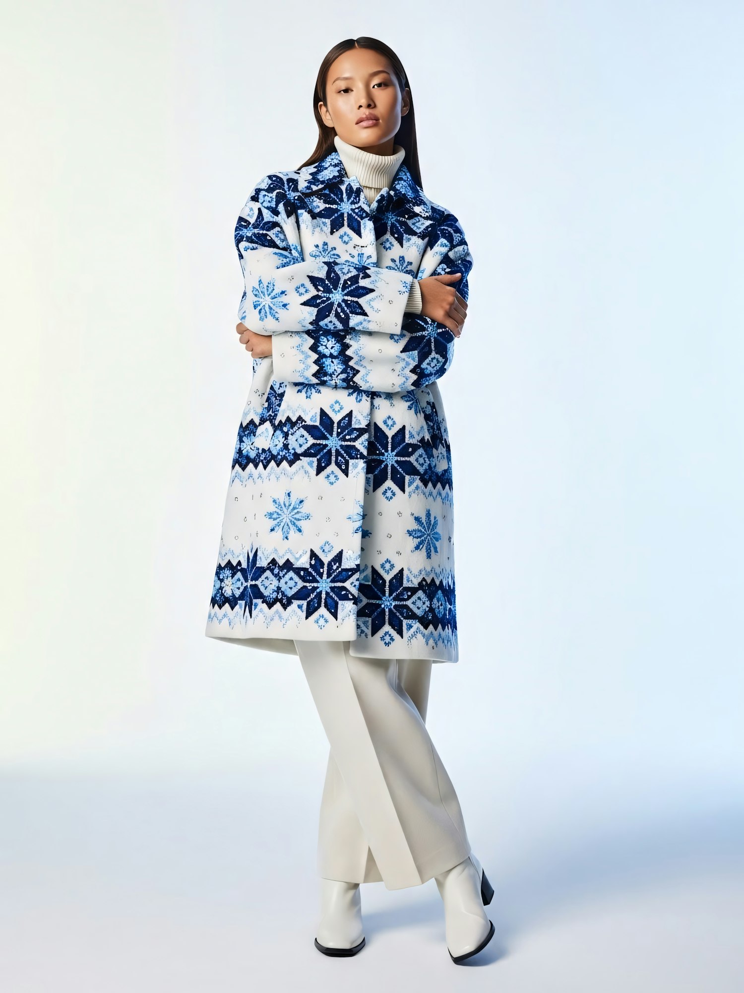 A woman in a blue and white snowflake-patterned coat, white trousers, and boots poses confidently against a light background.
