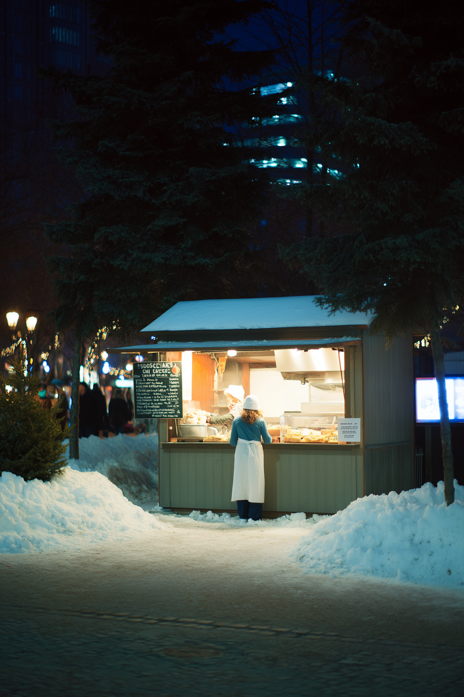 Warmly lit food stall in a Christmas Market during evening, with a worker in a blue jumper and white apron. Cozy, scenic atmosphere.