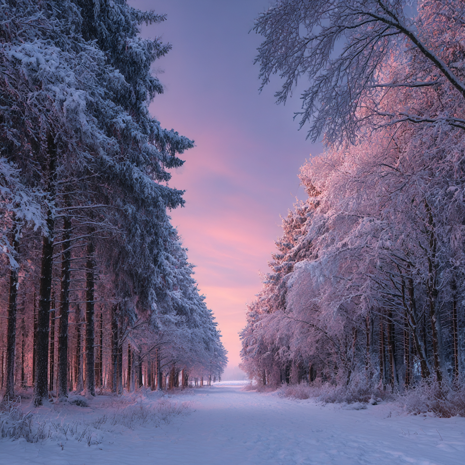 A tranquil winter forest path with snow-covered trees and a pink and purple sky, creating a serene and picturesque scene.