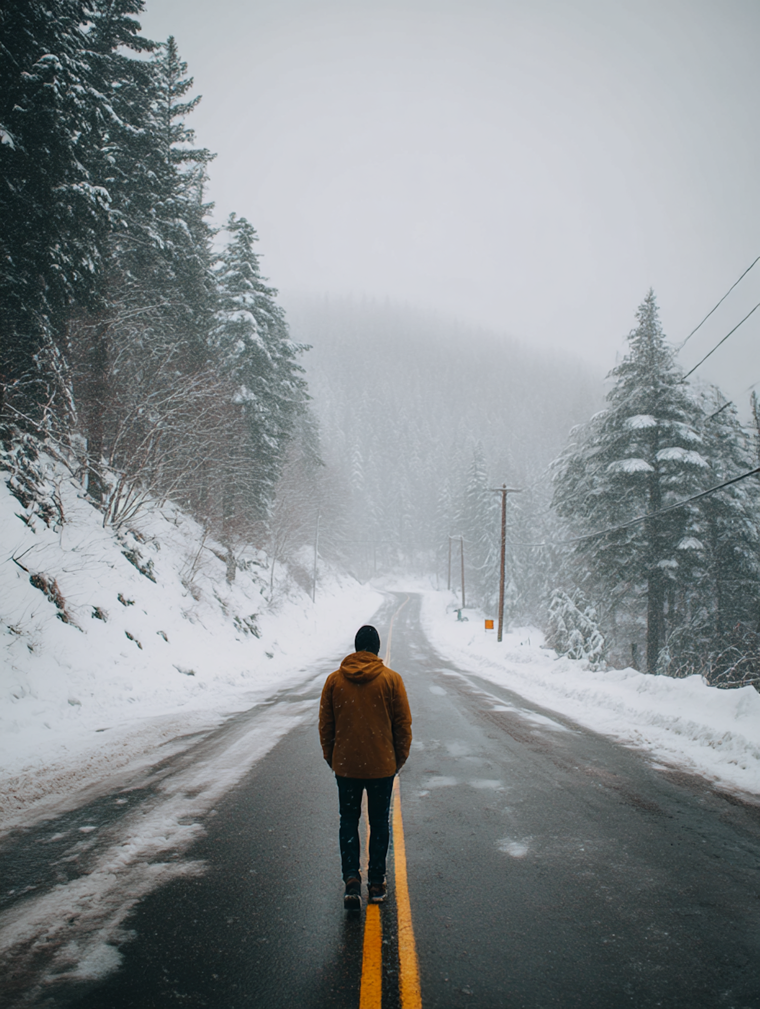A person walks down a snowy road surrounded by misty evergreen trees, creating a serene and tranquil winter scene.