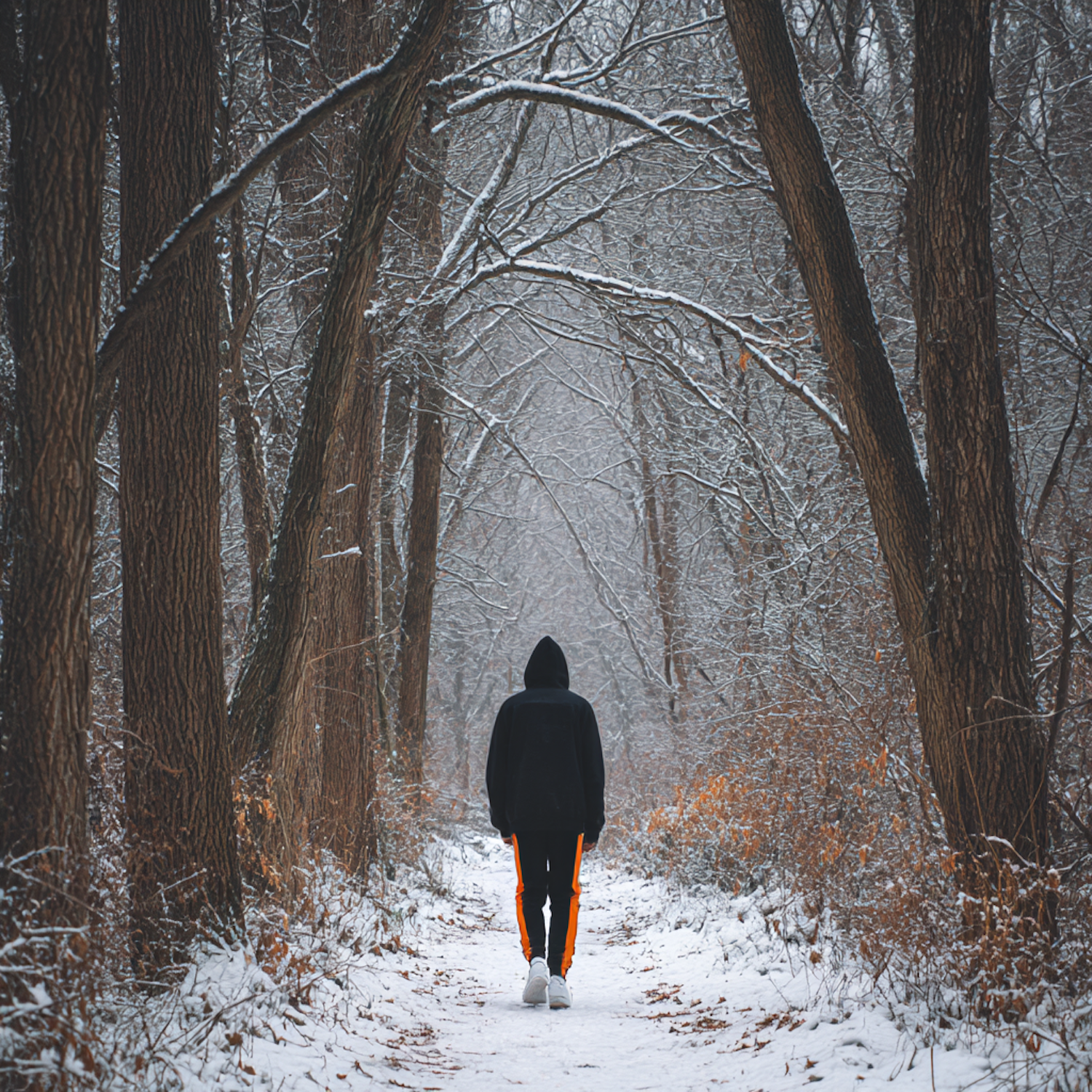A person in a black hoodie and orange-striped pants walks through a snowy forest, surrounded by tall, bare trees dusted with snow.