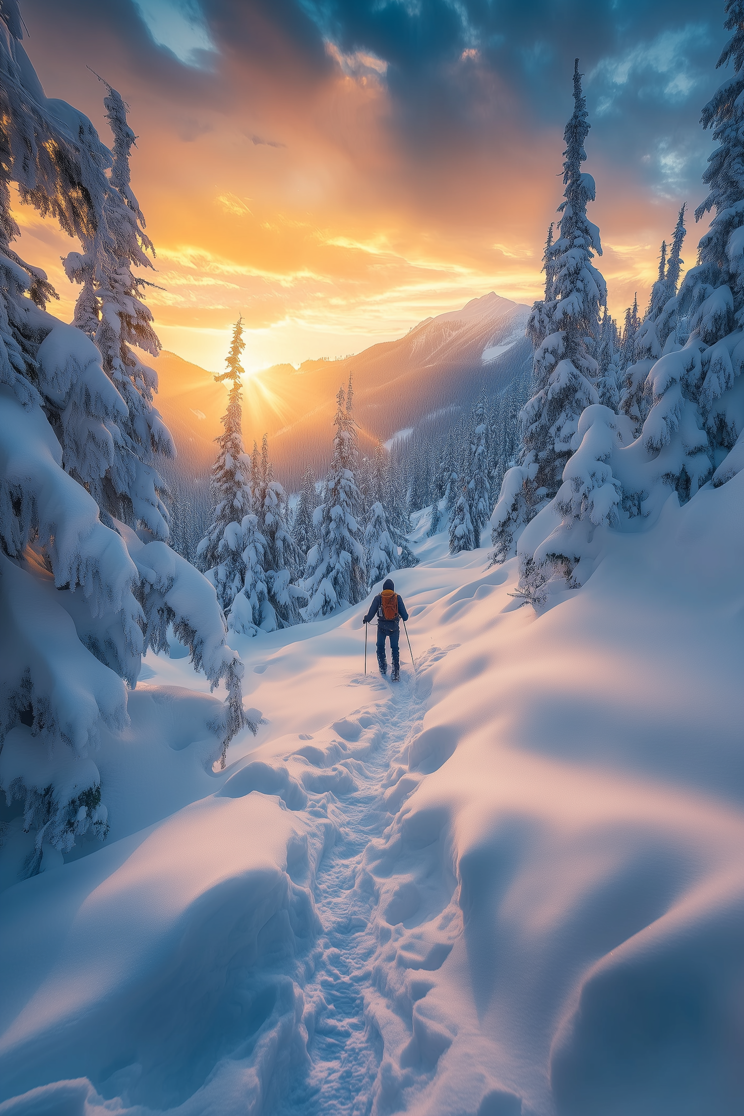 A hiker with an orange backpack treks through a snowy forest at sunset, surrounded by snow-laden trees and a golden sky.