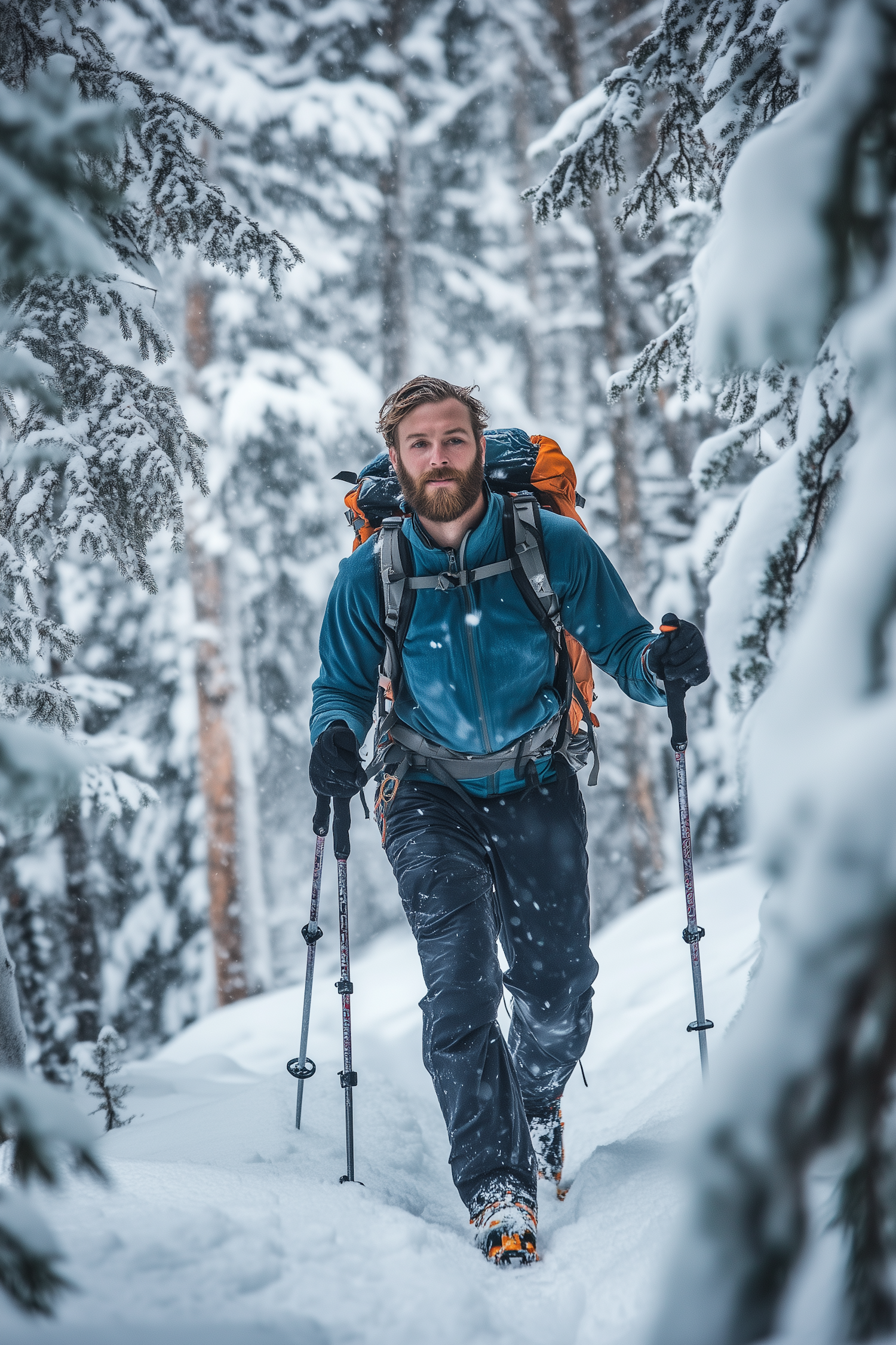 Man hiking through snowy forest with orange backpack and trekking poles, surrounded by snow-laden trees.