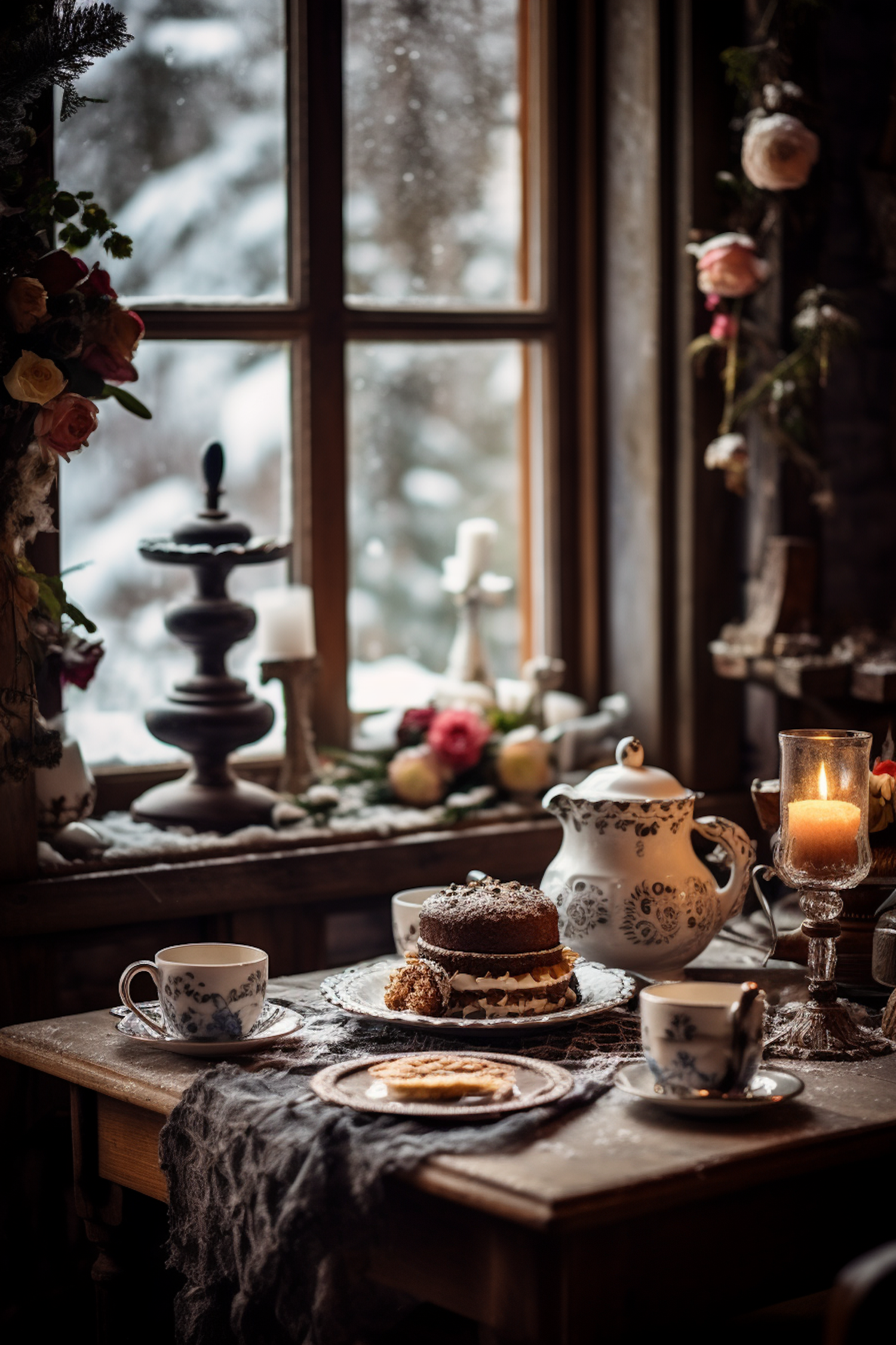 Cozy tea setting with a cake, teapot, and candle by a snowy window, creating a warm, rustic atmosphere.