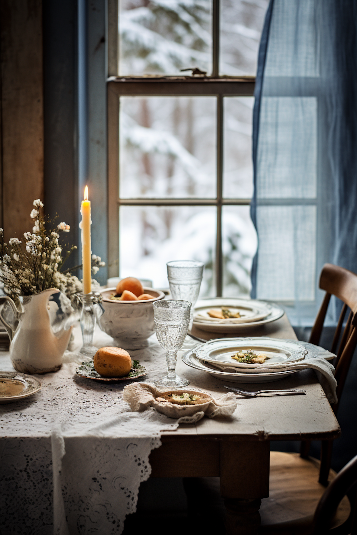 Cozy rustic dining table set by a snowy window, featuring lace tablecloth, lit candle, and elegant ceramic dishes.