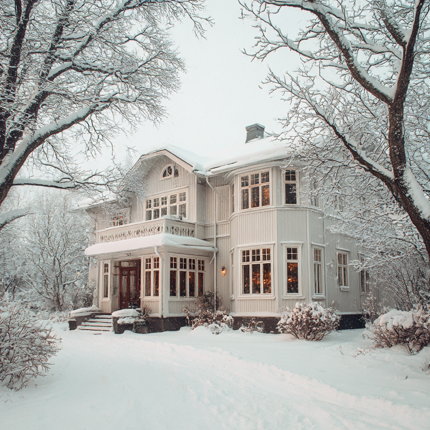 A cozy white house with glowing windows surrounded by snow-covered trees, creating a serene and inviting winter scene.