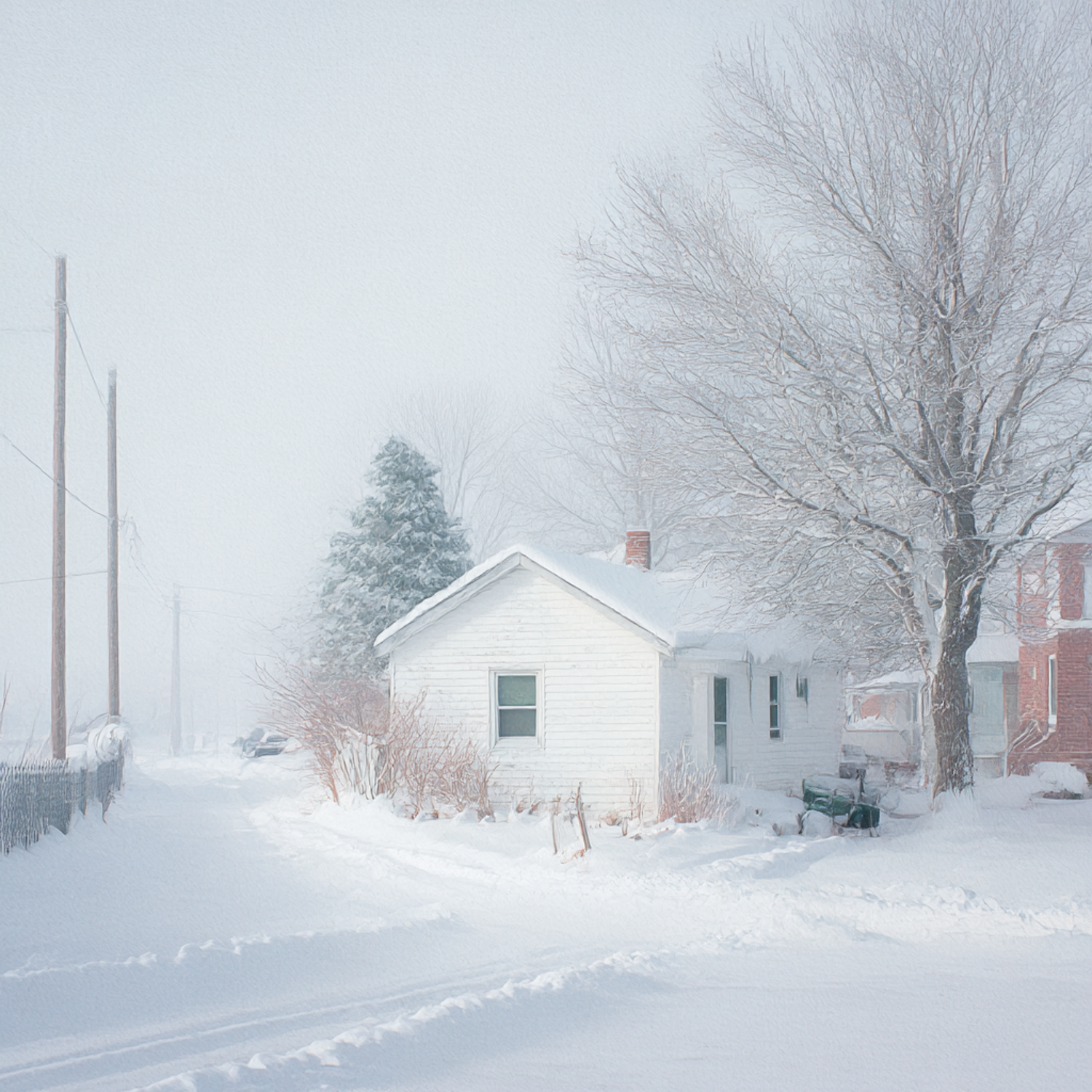 A cozy white house in a snowy landscape, surrounded by trees and a serene winter atmosphere, perfect for a peaceful retreat.