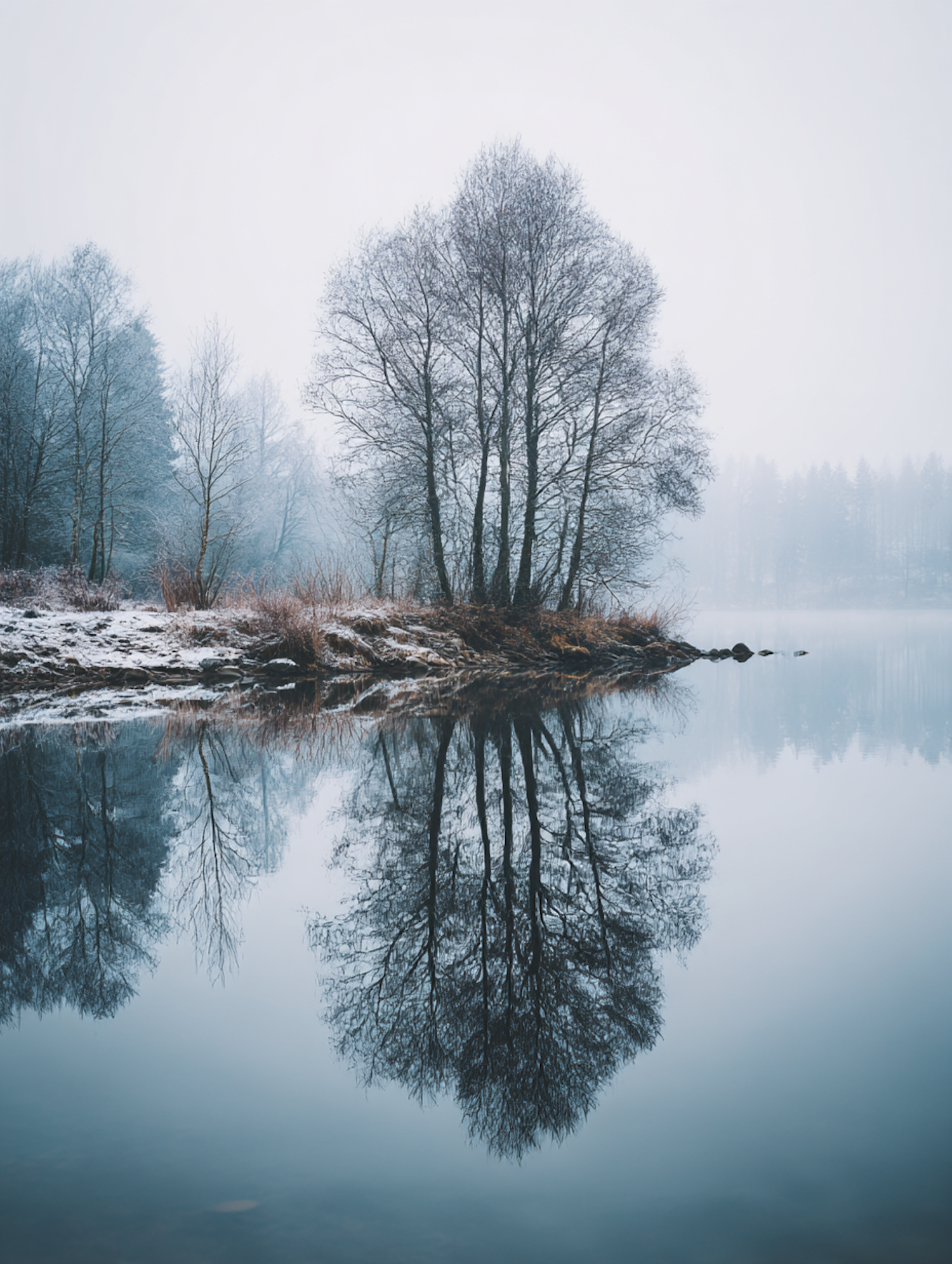 A tranquil winter scene with leafless trees reflected in a calm lake, surrounded by a snowy and misty landscape.