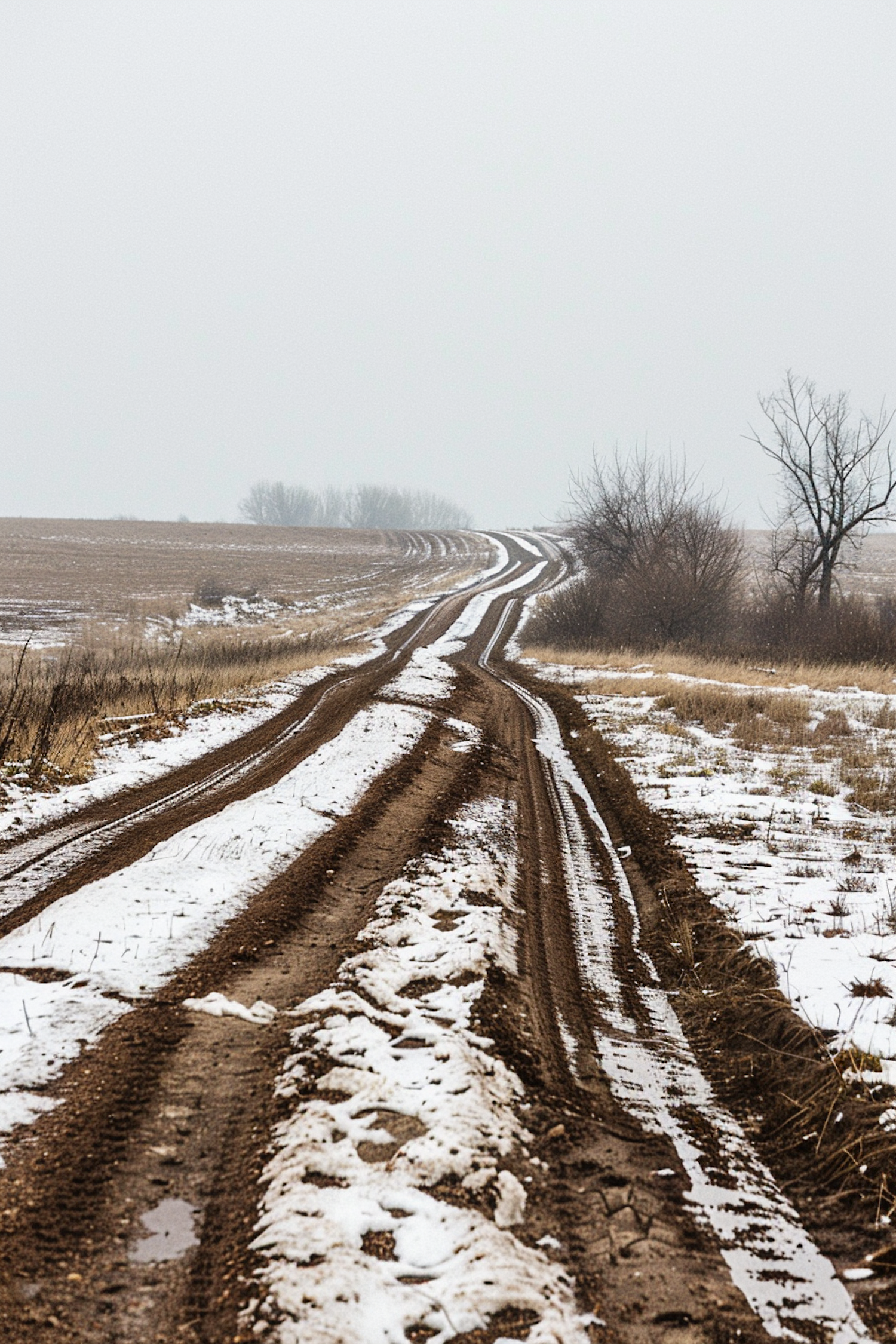 A winding dirt road with tire tracks through snowy fields under an overcast sky, creating a serene winter landscape.
