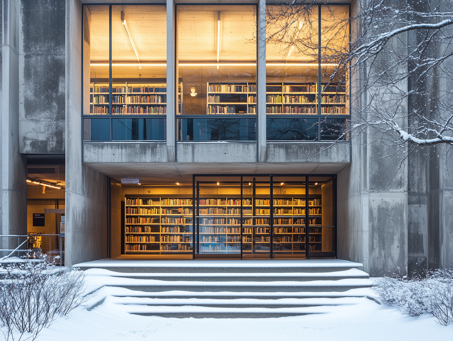 Modern library with large windows, warm lighting, and snow-covered steps, creating a cozy contrast with the cold exterior.