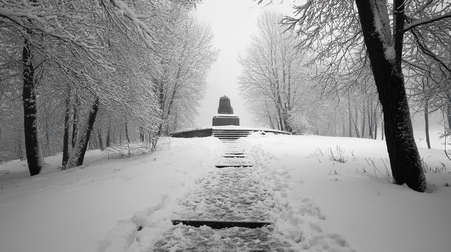 A snowy pathway leads to a monument surrounded by bare, snow-laden trees, creating a serene and tranquil winter scene.