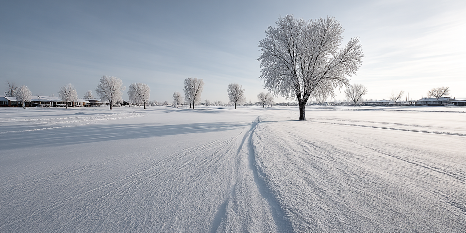 A tranquil winter scene with frost-covered trees, a snowy field, and a pale blue sky, creating a serene and peaceful atmosphere.