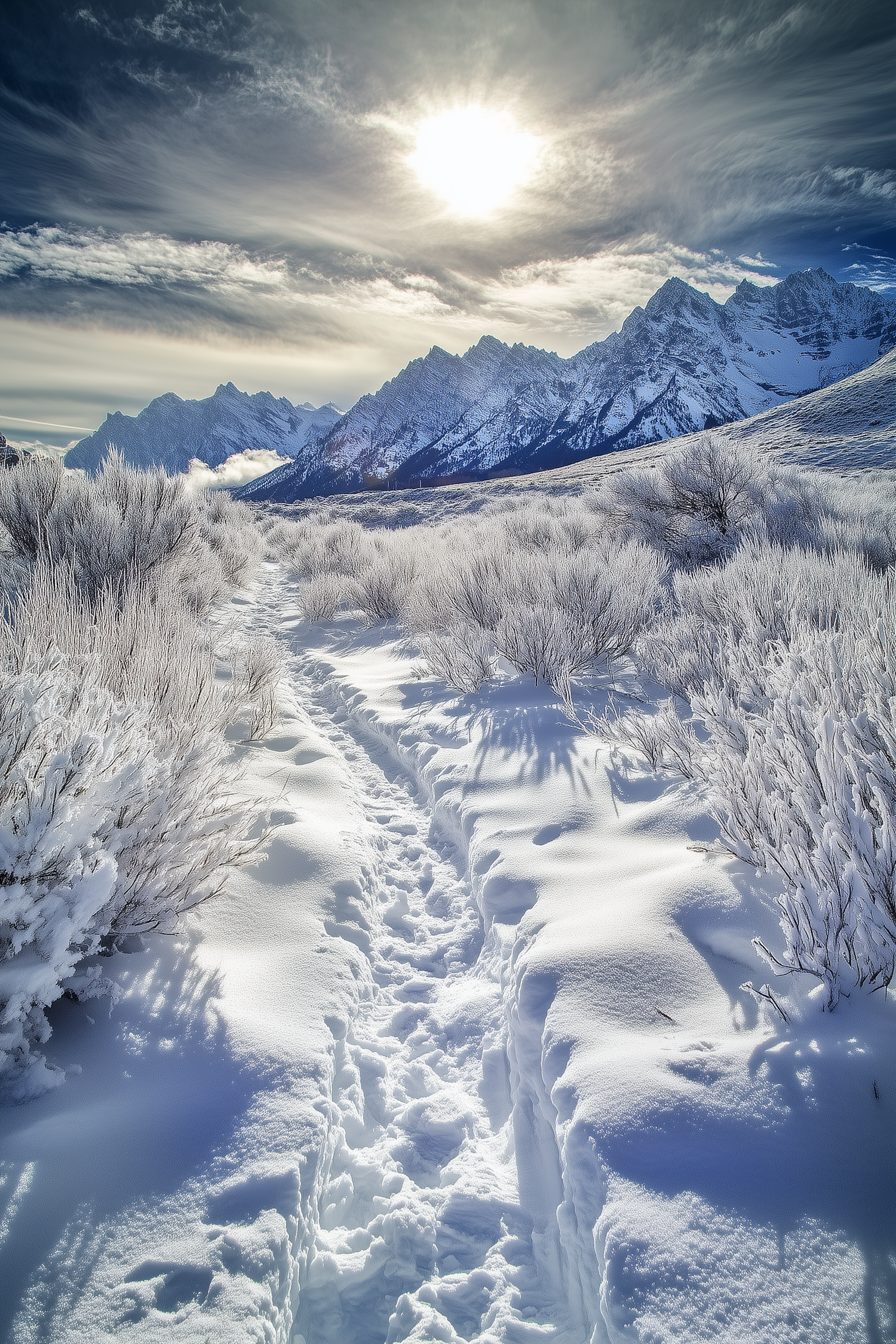 Snowy path through frosty shrubs leads to majestic mountains under a bright sun and clear sky, creating a serene winter landscape.