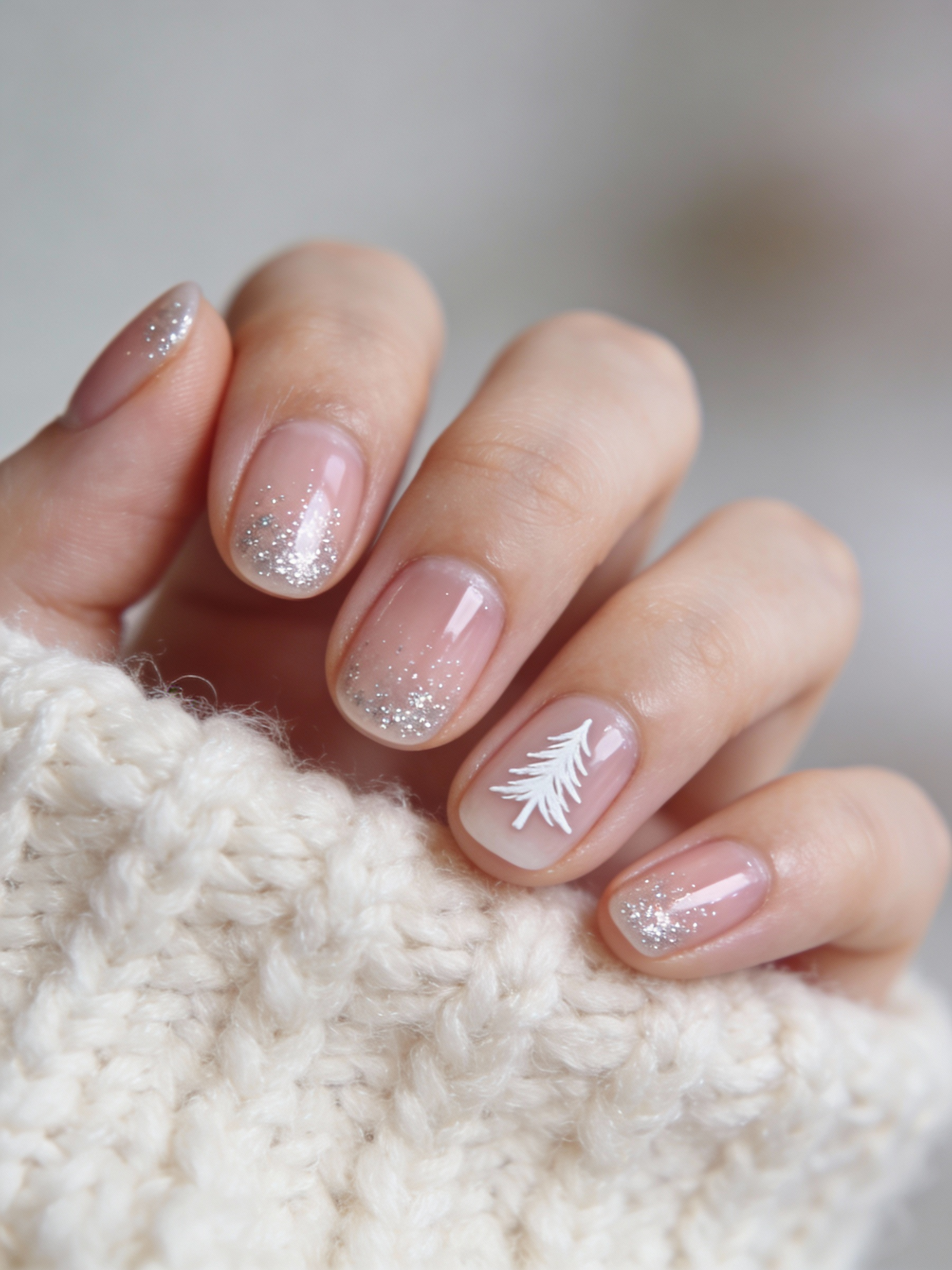 Macro beauty shot of short rounded nails in sheer milky pink with silver micro-glitter, one accent nail with a tiny minimalist pine tree outline in white, cozy cream knit sleeve, soft diffused lighting, neutral background, crisp macro.