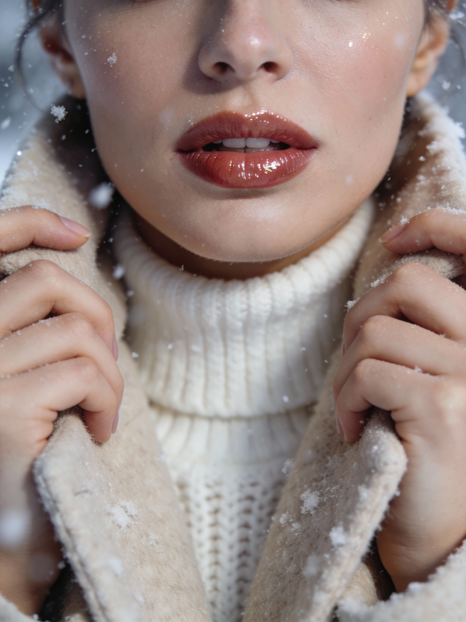 ultra-HD close-up fashion portrait of a beautiful woman lifting coat collar, glossy lips catching soft winter light; natural soft snowfall with tiny real snow particles, no fake flakes; beige wool coat and cream turtleneck; soft diffused lighting; crisp facial detail; elegant editorial tone