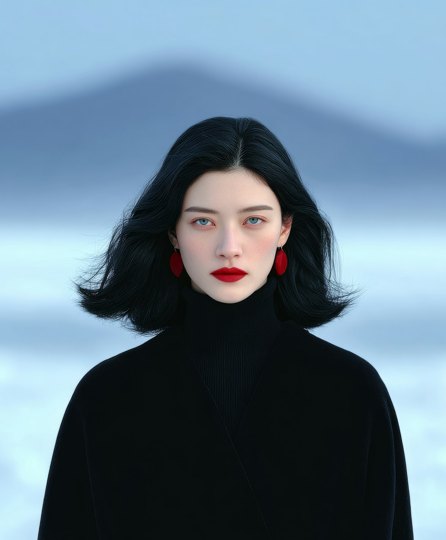 A striking portrait of a woman with dark hair, red lipstick, and earrings, set against a serene snowy background.