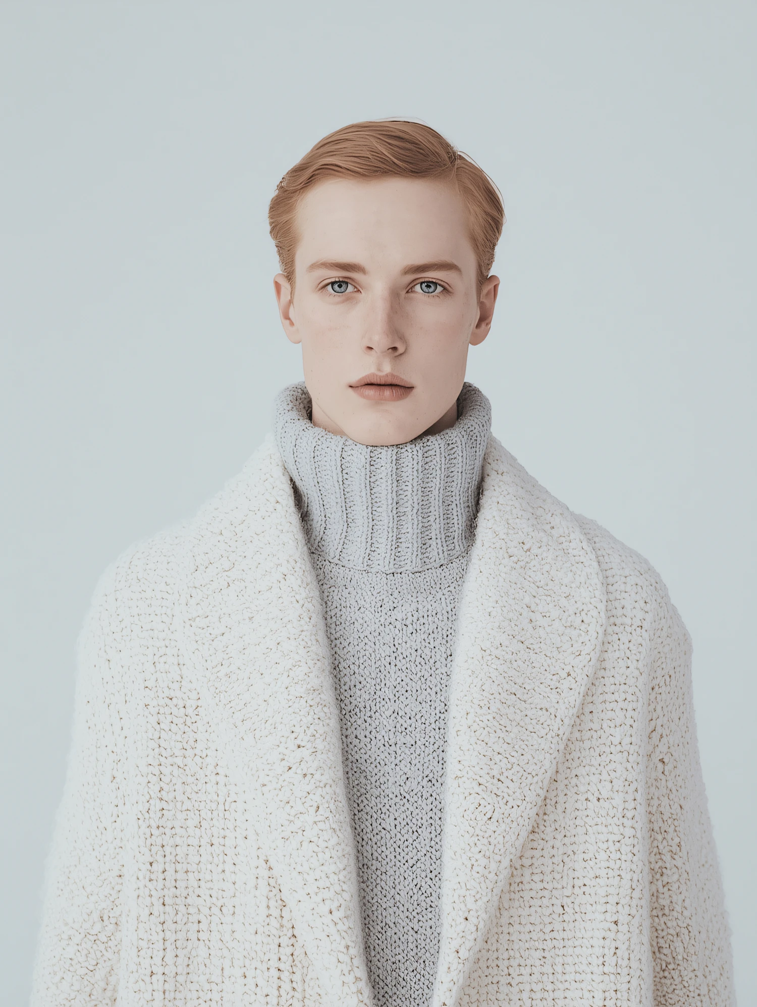 Minimalist portrait of a person in a white textured coat and gray turtleneck against a pale blue background, showcasing winter fashion.