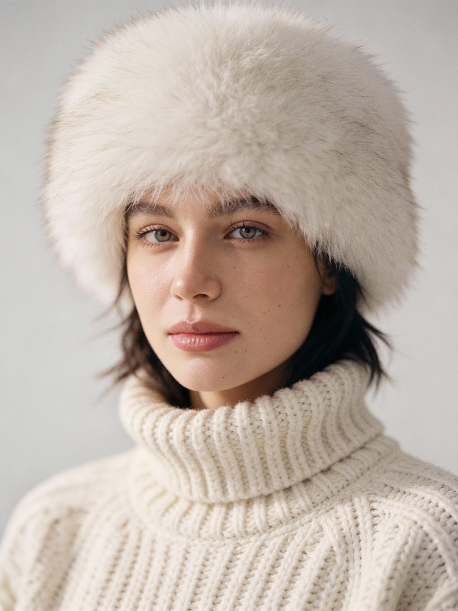 A person in a white fur hat and cream knit sweater, exuding cozy winter vibes with a neutral background.
