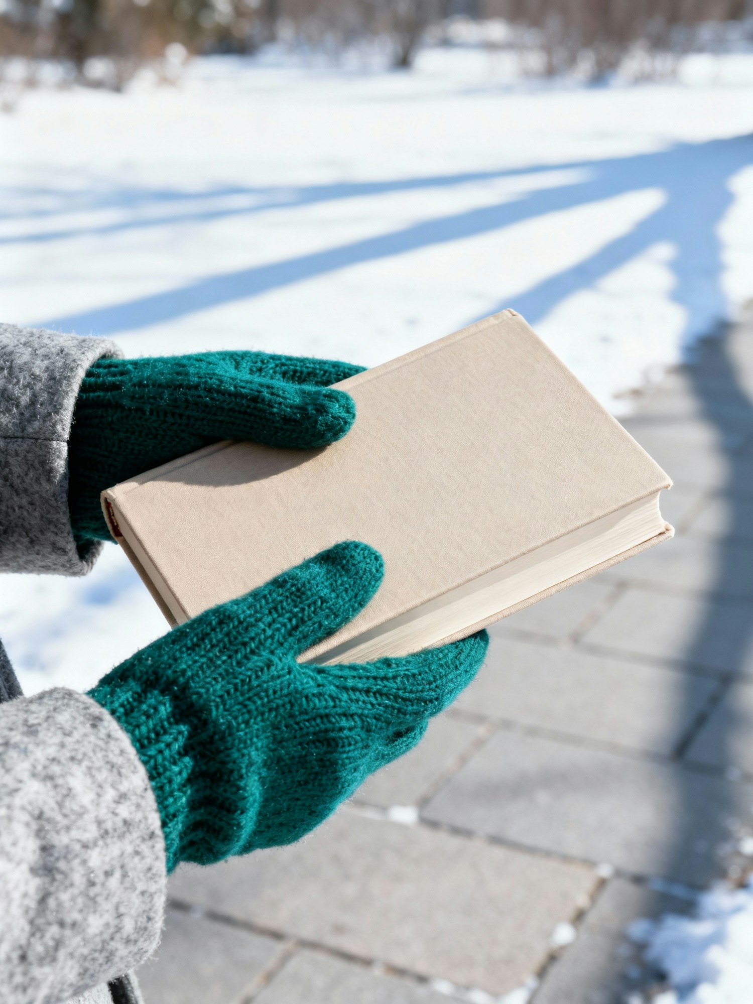 Soft winter editorial close-up in crisp sunlight. Hands in emerald-green knit gloves holding a simple beige book; grey wool coat sleeves visible. Snowy pavement casts long shadows, natural winter tones, subtle bokeh behind. Negative: fluorescent green, plastic texture, readable text on book.