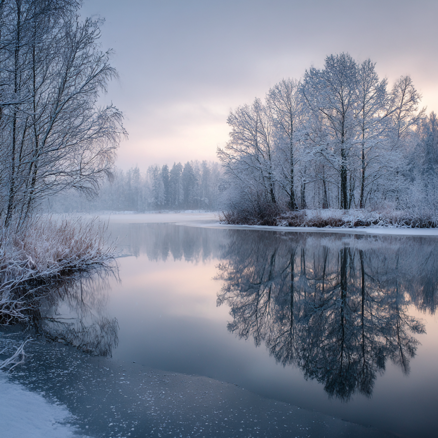 A tranquil winter river scene with snow-covered trees and their reflections in the calm water under a pastel-colored sky.