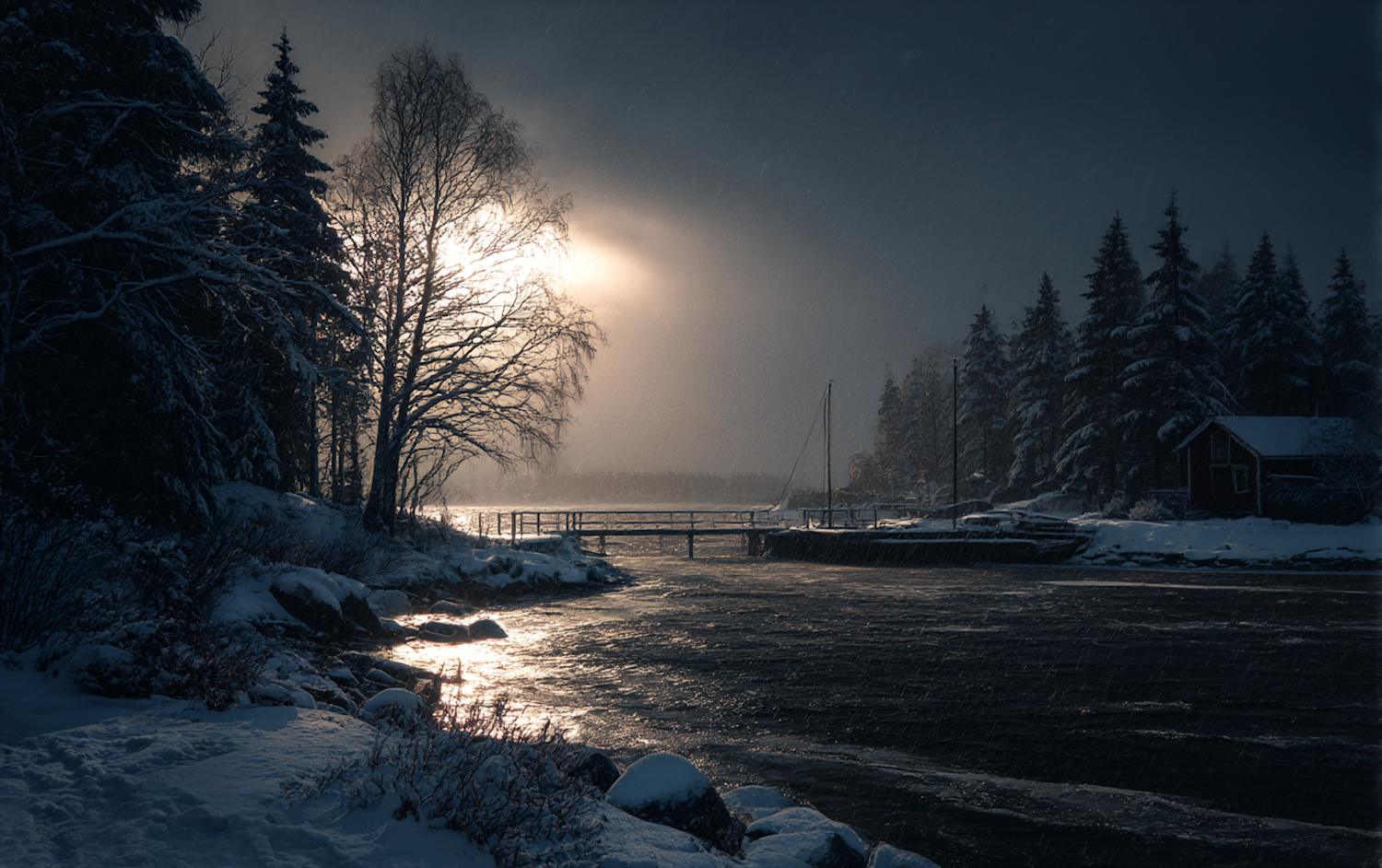 A tranquil winter scene with a snowy shoreline, a wooden pier, and a red cabin surrounded by snow-covered trees under a glowing sky.
