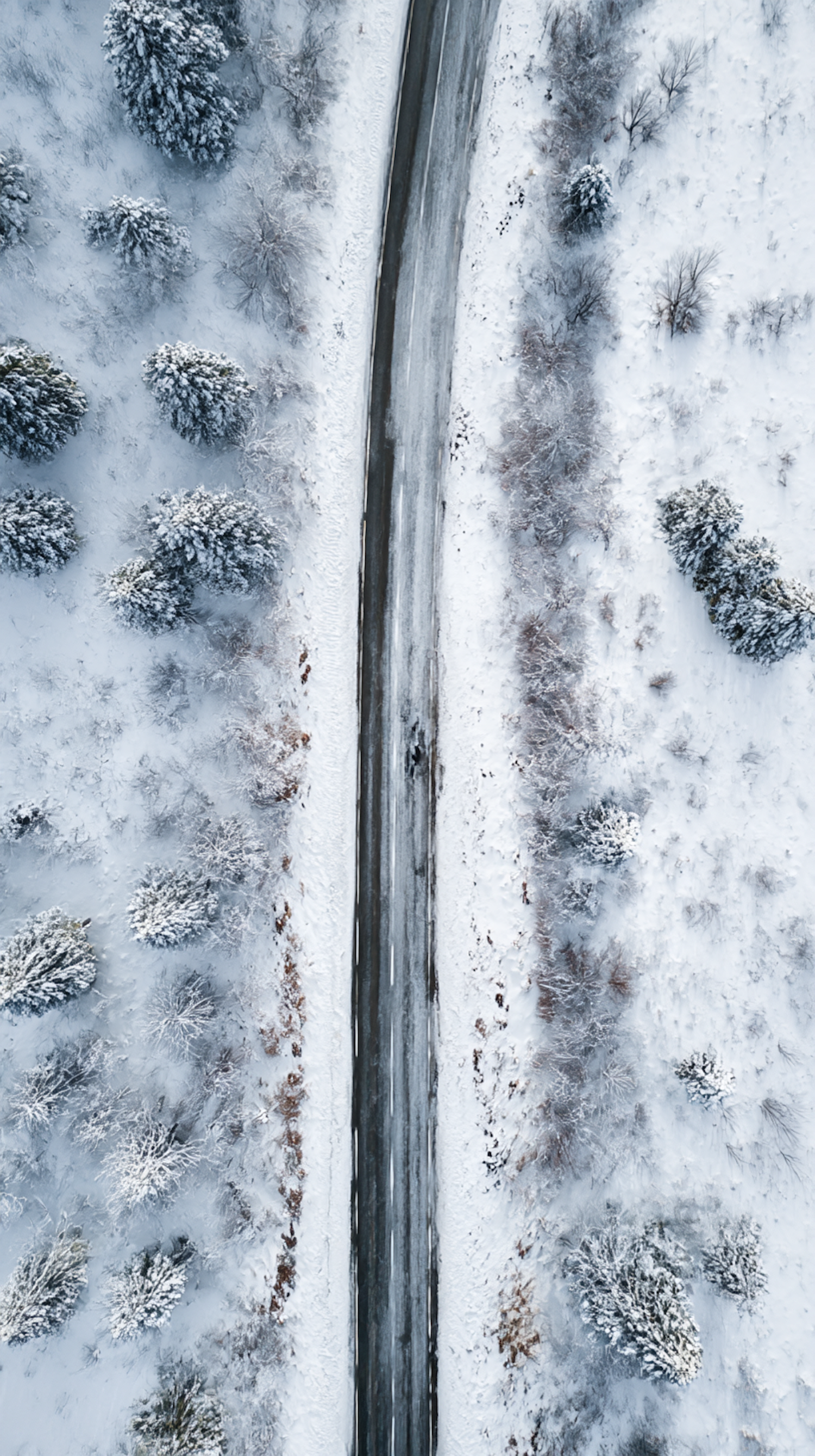 Aerial view of a snowy road surrounded by snow-covered trees and shrubs, showcasing a serene winter landscape.