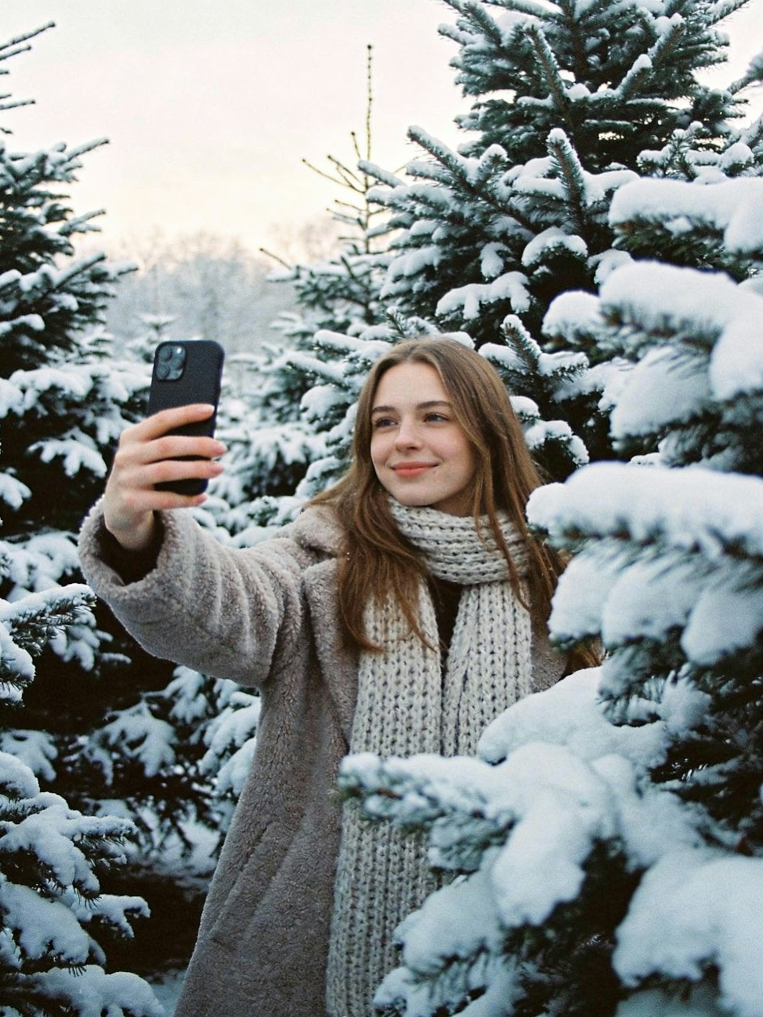 A woman in a cozy coat takes a selfie in a snowy forest, surrounded by snow-covered evergreens under a soft winter sky.