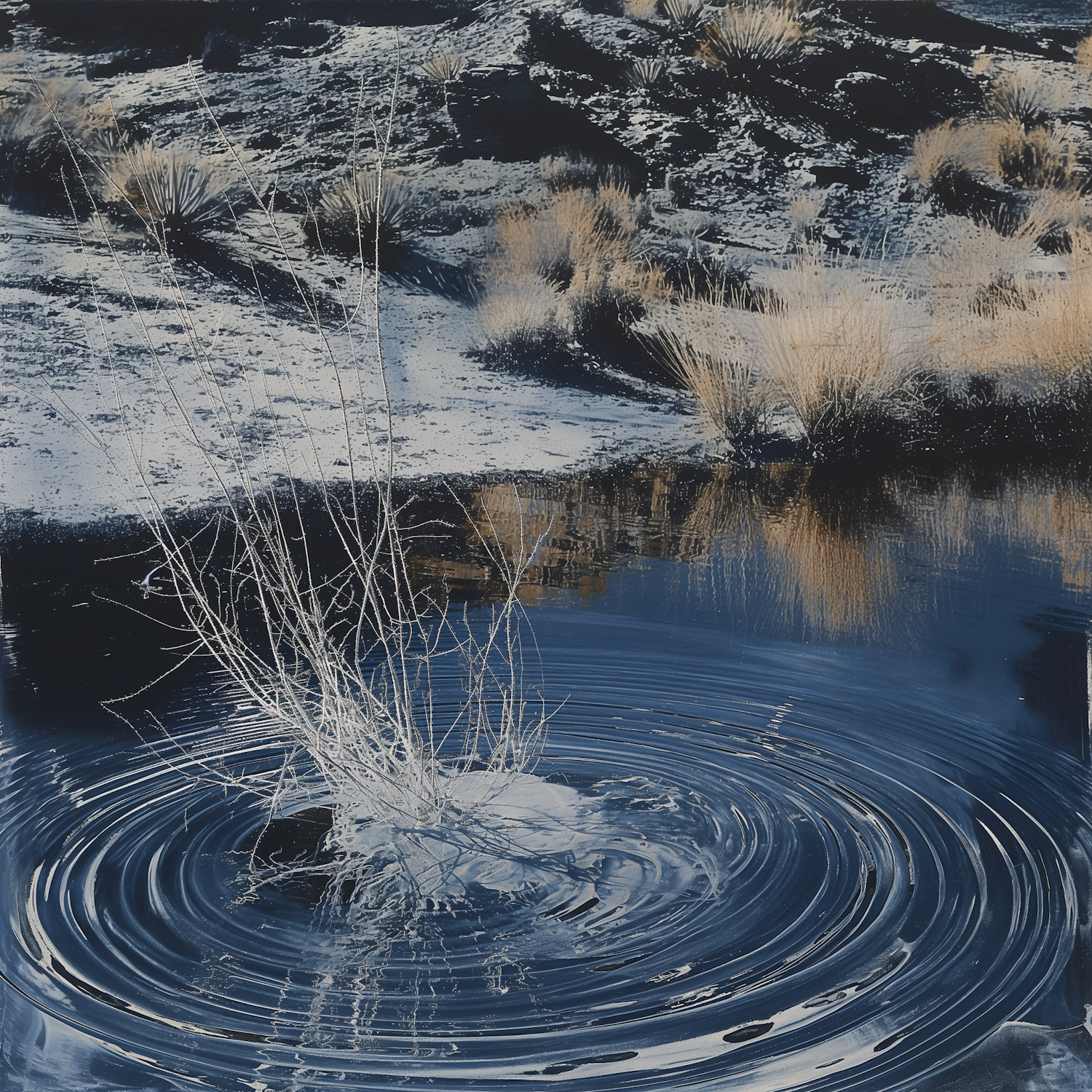 Serene landscape with rippling water, dry grasses, and rugged terrain in a harmonious blend of blues and earthy tones.