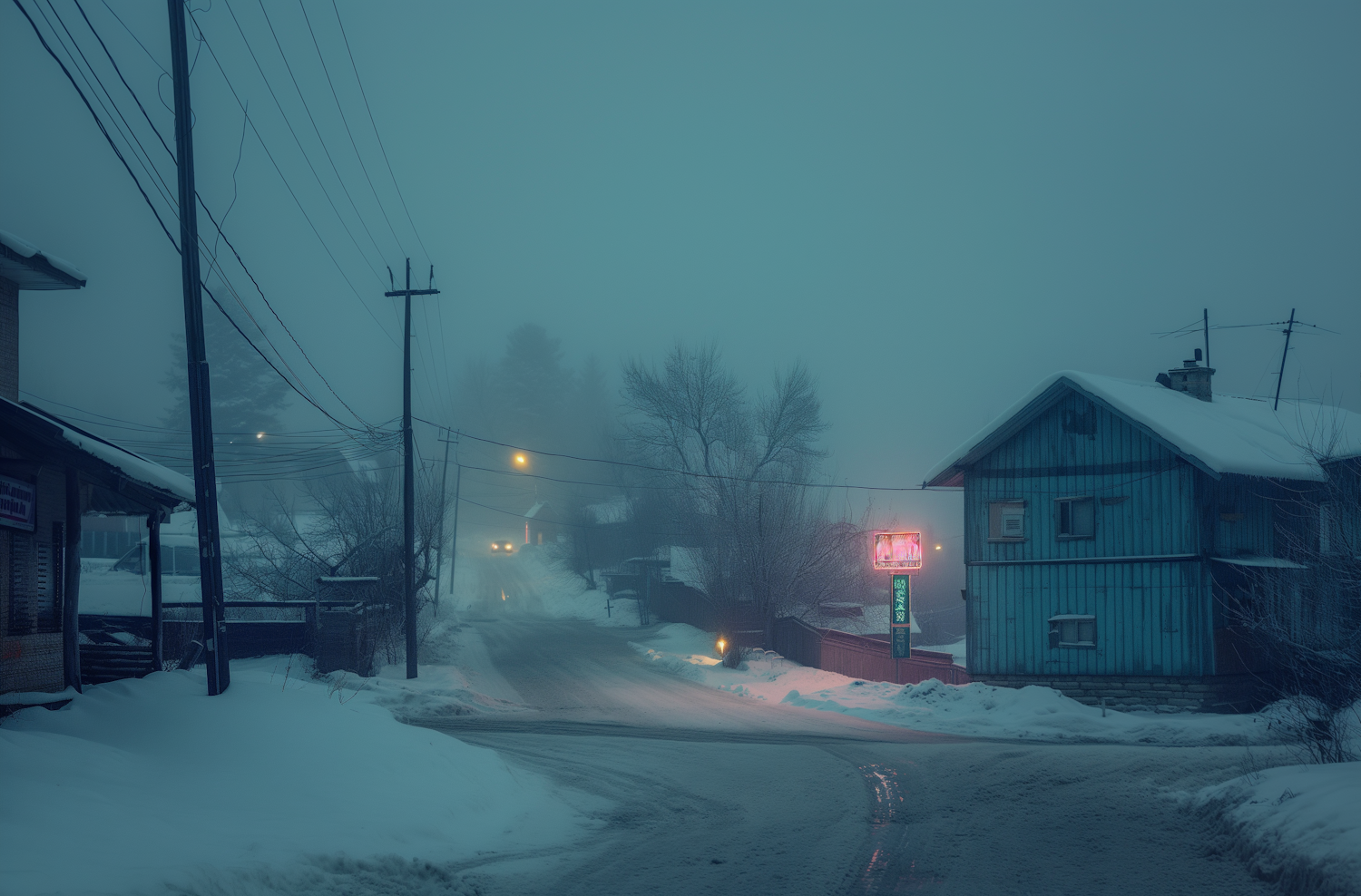 Foggy winter town with snow-covered streets, a glowing neon sign, and a blue wooden house under misty streetlights.