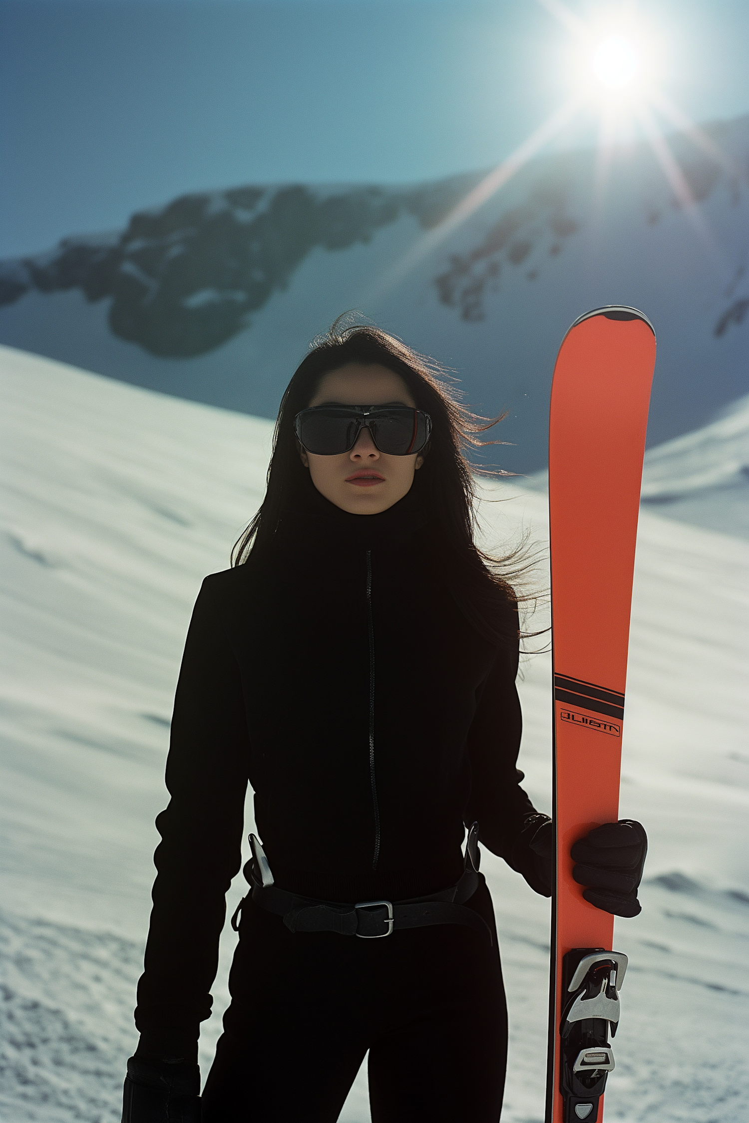 Woman in black ski suit with orange ski on snowy mountain, under bright sun and clear sky.